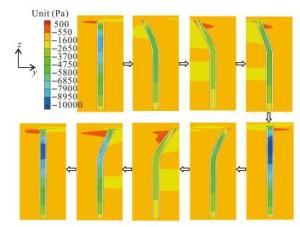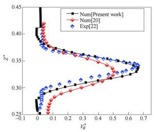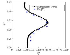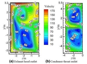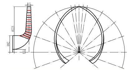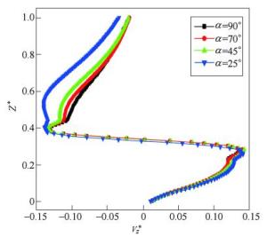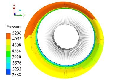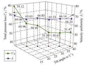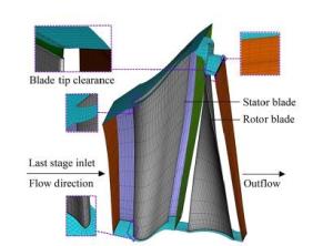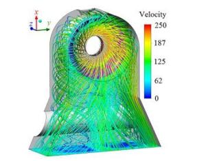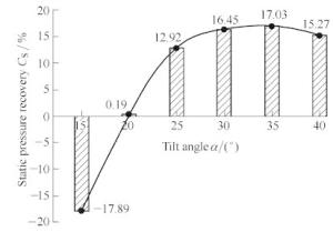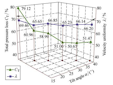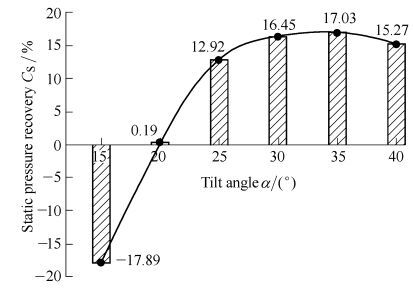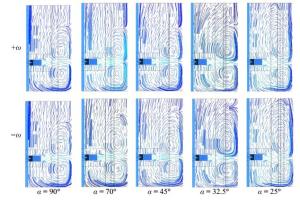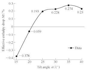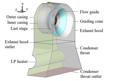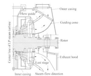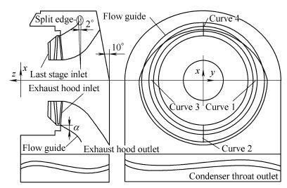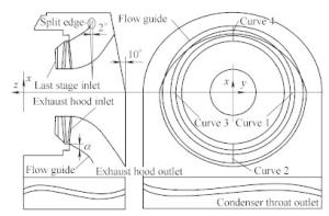 Heat transfer and vacuum in condenser are influenced by the aerodynamic performance of steam turbine exhaust hood. The current research on exhaust hood is mainly focused on analyzing flow loss and optimal design of its structure without consideration of the wet steam condensing flow and the exhaust hood coupled with the front and rear parts. To better understand the aerodynamic performance influenced by the tilt angle of flow guide inside a diffuser, taking a 600 MW steam turbine as an example, a numerical simulator CFX is adopted to solve compressible three-dimensional (3D) Reynolds time-averaged N-S equations and standard k-ε turbulence model. And the exhaust hood flow field influenced by different tilt angles of flow guide is investigated with consideration of the wet steam condensing flow and the exhaust hood coupled with the last stage blades and the condenser throat. The result shows that the total pressure loss coefficient and the static pressure recovery coefficient of exhaust hood change regularly and monotonously with the gradual increase of tilt angle of flow guide. When the tilt angle of flow guide is within the range of 30° to 40°, the static pressure recovery coefficient is in the range of 15.27% to 17.03% and the total pressure loss coefficient drops to approximately 51%, the aerodynamic performance of exhaust hood is significantly improved. And the effective enthalpy drop in steam turbine increases by 0.228% to 0.274%. It is feasible to obtain a reasonable title angle of flow guide by the method of coupling the last stage and the condenser throat to exhaust hood in combination of the wet steam model, which provides a practical guidance to flow guide transformation and optimal design in exhaust hood.