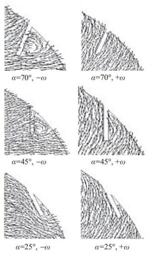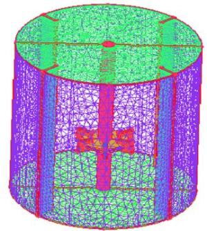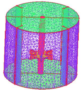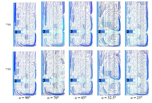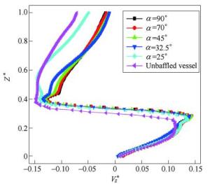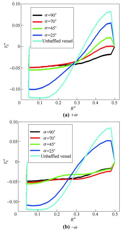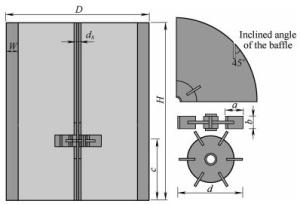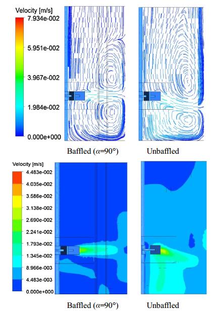 The role of baffles in mechanically stirred tanks is to promote the stability of power drawn by the impeller and to avoid the fluid swirling, thus enhancing mixing. The present paper numerically investigates the baffles effects in a vessel stirred by a Rushton turbine. The geometric factor of interest is the baffle inclination which is varying between 25°, 32.5°, 45°, 70° and 90° at different impeller rotational speeds. The impeller rotational direction has also been varied. The vortex size and power consumption were evaluated for each geometrical configuration. It was found that the best configuration is the baffle inclination by α = 70° at a negative angular velocity.