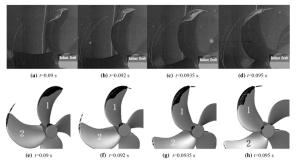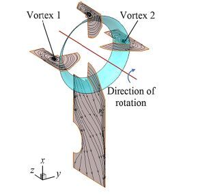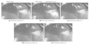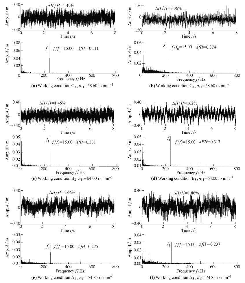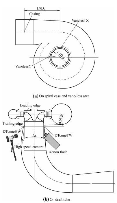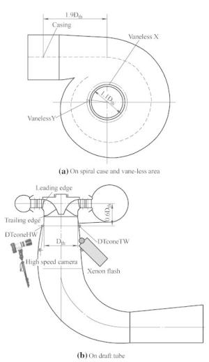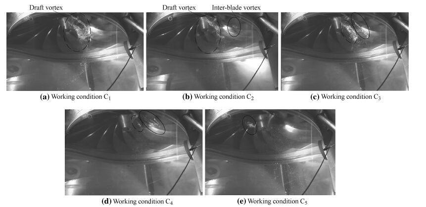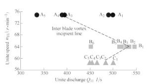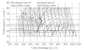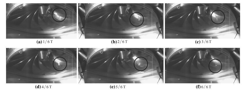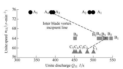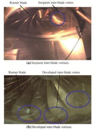 The inter-blade vortex in a Francis turbine becomes one of the main hydraulic factors that are likely to cause blade erosion at deep part load operating conditions. However, the causes and the mechanism of interblade vortex are still under investigation according to present researches. Thus the causes of inter-blade vortex and the effect of different hydraulic parameters on the inter-blade vortex are investigated experimentally. The whole life cycle of the inter-blade vortex is observed by a high speed camera. The test results illustrate the whole life cycle of the inter-blade vortex from generation to separation and even to fading. It is observed that the interblade vortex becomes stronger with the decreasing of flow and head, which leads to pressure fluctuation. Meanwhile, the pressure fluctuations in the vane-less area and the draft tube section become stronger when inter-blade vortices exist in the blade channel. The turbine will be damaged if operating in the inter-blade vortex zone, so its operating range must be far away from that zone. This paper reveals the main cause of the inter-blade vortex which is the larger incidence angle between the inflow angle and the blade angle on the leading edge of the runner at deep part load operating conditions.