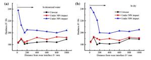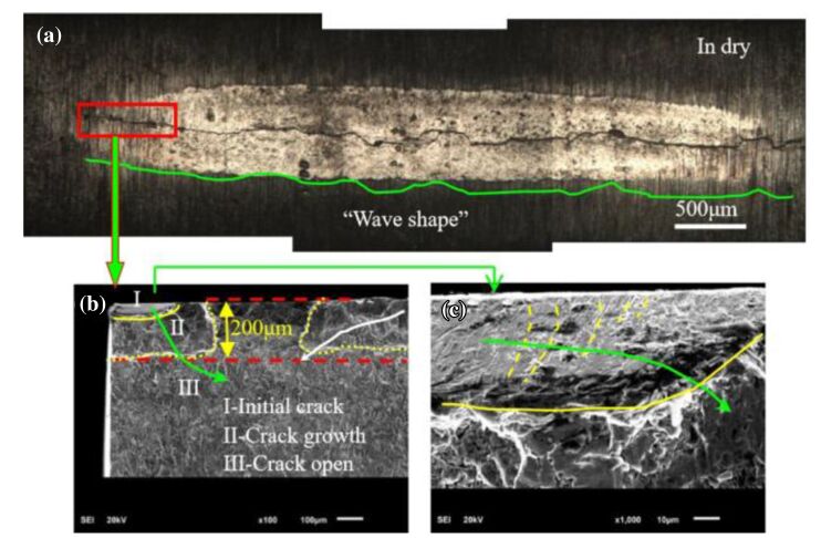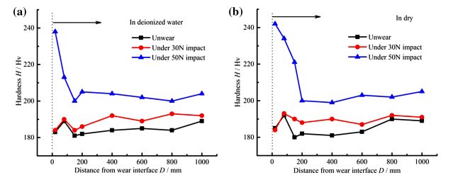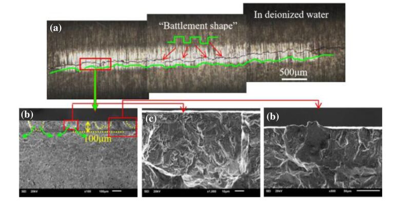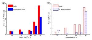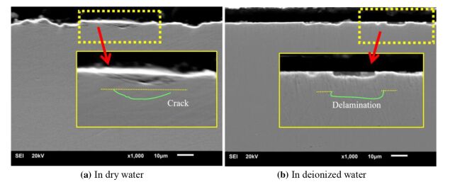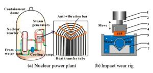 The impact fretting wear has largely occurred at nuclear power device induced by the flow-induced vibration, and it will take potential hazards to the service of the equipment. However, the present study focuses on the tangential fretting wear of alloy 690 tubes. Research on impact fretting wear of alloy 690 tubes is limited and the related research is imminent. Therefore, impact fretting wear behavior of alloy 690 tubes against 304 stainless steels is investigated. Deionized water is used to simulate the flow environment of the equipment, and the dry environment is used for comparison. Varied analytical techniques are employed to characterize the wear and tribochemical behavior during impact fretting wear. Characterization results indicate that cracks occur at high impact load in both water and dry equipment; however, the water as a medium can significantly delay the cracking time. The crack propagation behavior shows a jagged shape in the water, but crack extended disorderly in dry equipment because the water changed the stress distribution and retarded the friction heat during the wear process. The SEM and XPS analysis shows that the main failure mechanisms of the tube under impact fretting are fatigue wear and friction oxidation. The effect of medium(water) on fretting wear is revealed, which plays a potential and promising role in the service of nuclear power device and other flow equipments.