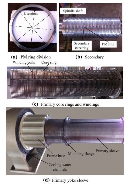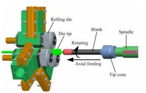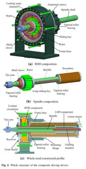 The existing plastic forming equipment are mostly driven by traditional AC motors with long transmission chains, low efficiency, large size, low precision and poor dynamic response are the common disadvantages. In order to realize high performance forming processes, the driving device should be improved, especially for complicated processing motions. Based on electric servo direct drive technology, a novel AC servo rotating and linear composite driving device is proposed, which features implementing both spindle rotation and feed motion without transmission, so that compact structure and precise control can be achieved. Flux switching topology is employed in the rotating drive component for strong robustness, and fractional slot is employed in the linear direct drive component for large force capability. Then the mechanical structure for compositing rotation and linear motion is designed. A device prototype is manufactured, machining of each component and the whole assembly are presented respectively. Commercial servo amplifiers are utilized to construct the control system of the proposed device. To validate the effectiveness of the proposed composite driving device, experimental study on the dynamic test benches are conducted. The results indicate that the output torque can attain to 420 N-m and the dynamic tracking errors are less than about 0.3 rad in the rotating drive. the dynamic tracking errors are less than about 1.6 mm in the linear feed. The proposed research provides a method to construct high efficiency and accuracy direct driving device in plastic forming equipment.