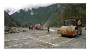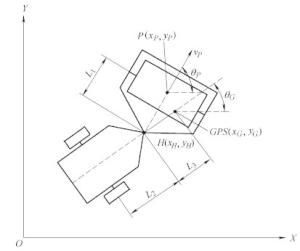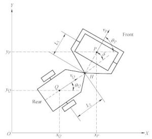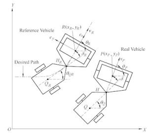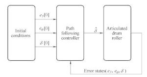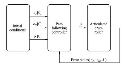Automatic navigation of an articulated drum roller, which is an articulated steering type vehicle widely used in the construction industry, is highly expected for operation cost reduction and improvement of work efficiency. In order to achieve the path following control, considering that its steering system is articulated steering and two frames are articulated by an active revolute joint, a kinematic model and an error dynamic state-space equation of an articulated drum roller are proposed. Besides, a statefeedback control law based on Lyapunov stability theory is also designed, which can be proved to achieve the purpose of control by the analysis of stability. What's more, to evaluate the performance of the proposed method, simulation under the MATLAB/Simulink and experiments using positioning algorithm and errors correction at the uneven construction site are performed, with initial displacement error (-1.5 m), heading error (-0.11 rad) and steering angle (-0.19 rad). Finally, simulation and experimental results show that the errors and steering angle can decrease gradually, and converge to zero with time. Meanwhile, the control input is not saturated. An articulated drum roller can lock into a desired path with the proposed method in uneven fields.