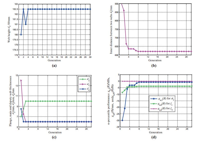 Uncertainties in parameters such as materials, loading, and geometry are inevitable in designing metallic structures for cranes. When considering these uncertainty factors, reliability-based design optimization (RBDO) offers a more reasonable design approach. However, existing RBDO methods for crane metallic structures are prone to low convergence speed and high computational cost. A unilevel RBDO method, combining a discrete imperialist competitive algorithm with an inverse reliability strategy based on the performance measure approach, is developed. Application of the imperialist competitive algorithm at the optimization level significantly improves the convergence speed of this RBDO method. At the reliability analysis level, the inverse reliability strategy is used to determine the feasibility of each probabilistic constraint at each design point by calculating its α-percentile performance, thereby avoiding convergence failure, calculation error, and disproportionate computational effort encountered using conventional moment and simulation methods. Application of the RBDO method to an actual crane structure shows that the developed RBDO realizes a design with the best tradeoff between economy and safety together with about one-third of the convergence speed and the computational cost of the existing method. This paper provides a scientific and effective design approach for the design of metallic structures of cranes.