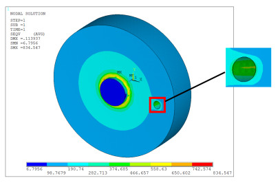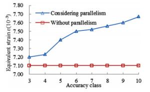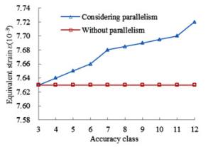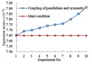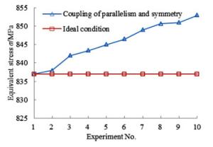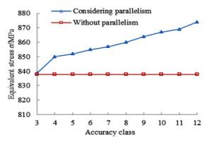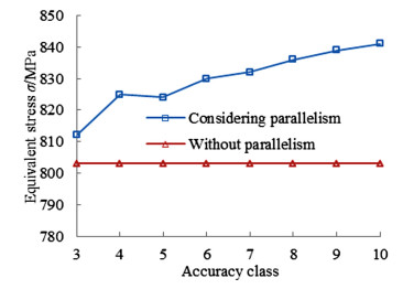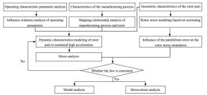 Stress, strain and vibration characteristics of rotor parts should be changed significantly under high acceleration, manufacturing error is one of the most important reason. However, current research on this problem has not been carried out. A rotor with an acceleration of 150, 000 g is considered as the objective, the effects of manufacturing errors on rotor mechanical properties and dynamic characteristics are executed by the selection of the key affecting factors. Through the force balance equation of the rotor infinitesimal unit establishment, a theoretical model of stress calculation based on slice method is proposed and established, a formula for the rotor stress at any point derives. A finite element model (FEM) of rotor with holes is established with manufacturing errors. The changes of the stresses and strains of a rotor in parallelism and symmetry errors are analyzed, which verify the validity of the theoretical model. The pre-stressing modal analysis is performed based on the aforementioned static analysis. The key dynamic characteristics are analyzed. The results demonstrated that, as the parallelism and symmetry errors increase, the equivalent stresses and strains of the rotor slowly increase linearly, the highest growth rate does not exceed 4%, the maximum change rate of natural frequency is 0.1%. The rotor vibration mode is not significantly affected. The FEM construction method of the rotor with manufacturing errors can be utilized for the quantitative research on rotor characteristics, which will assist in the active control of rotor component reliability under high acceleration.