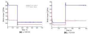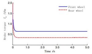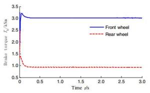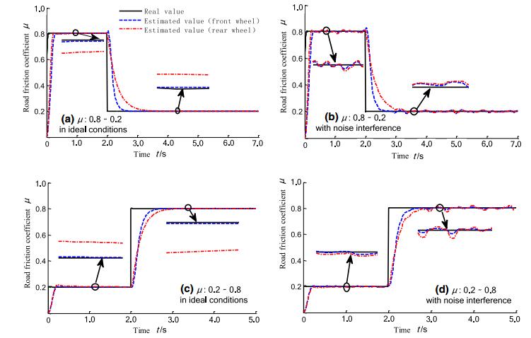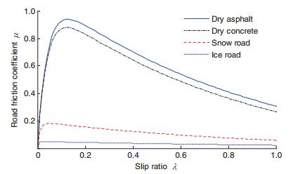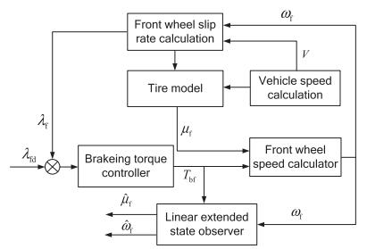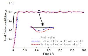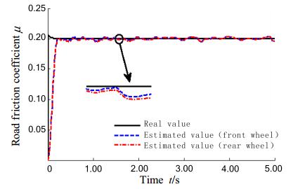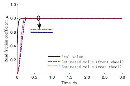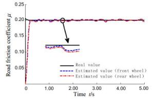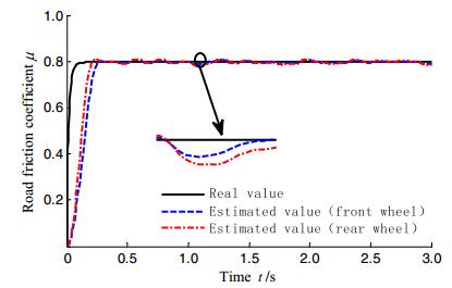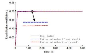 The accurate estimation of road friction coefficient in the active safety control system has become increasingly prominent. Most previous studies on road friction estimation have only used vehicle longitudinal or lateral dynamics and often ignored the load transfer, which tends to cause inaccurate of the actual road friction coefficient. A novel method considering load transfer of front and rear axles is proposed to estimate road friction coefficient based on braking dynamic model of two-wheeled vehicle. Sliding mode control technique is used to build the ideal braking torque controller, which control target is to control the actual wheel slip ratio of front and rear wheels tracking the ideal wheel slip ratio. In order to eliminate the chattering problem of the sliding mode controller, integral switching surface is used to design the sliding mode surface. A second order linear extended state observer is designed to observe road friction coefficient based on wheel speed and braking torque of front and rear wheels. The proposed road friction coefficient estimation schemes are evaluated by simulation in ADAMS/Car. The results show that the estimated values can well agree with the actual values in different road conditions. The observer can estimate road friction coefficient exactly in real-time and resist external disturbance. The proposed research provides a novel method to estimate road friction coefficient with strong robustness and more accurate.
