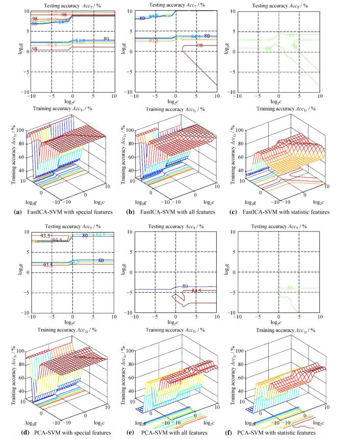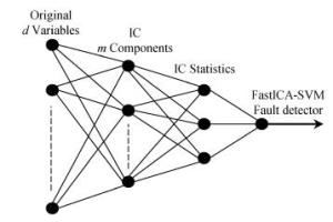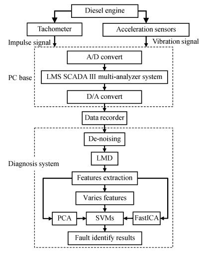 Numerous vibration-based techniques are rarely used in diesel engines fault diagnosis in a direct way, due to the surface vibration signals of diesel engines with the complex non-stationary and nonlinear time-varying features. To investigate the fault diagnosis of diesel engines, fractal correlation dimension, wavelet energy and entropy as features reflecting the diesel engine fault fractal and energy characteristics are extracted from the decomposed signals through analyzing vibration acceleration signals derived from the cylinder head in seven different states of valve train. An intelligent fault detector FastICA-SVM is applied for diesel engine fault diagnosis and classification. The results demonstrate that FastICA-SVM achieves higher classification accuracy and makes better generalization performance in small samples recognition. Besides, the fractal correlation dimension and wavelet energy and entropy as the special features of diesel engine vibration signal are considered as input vectors of classifier FastICASVM and could produce the excellent classification results. The proposed methodology improves the accuracy of feature extraction and the fault diagnosis of diesel engines.