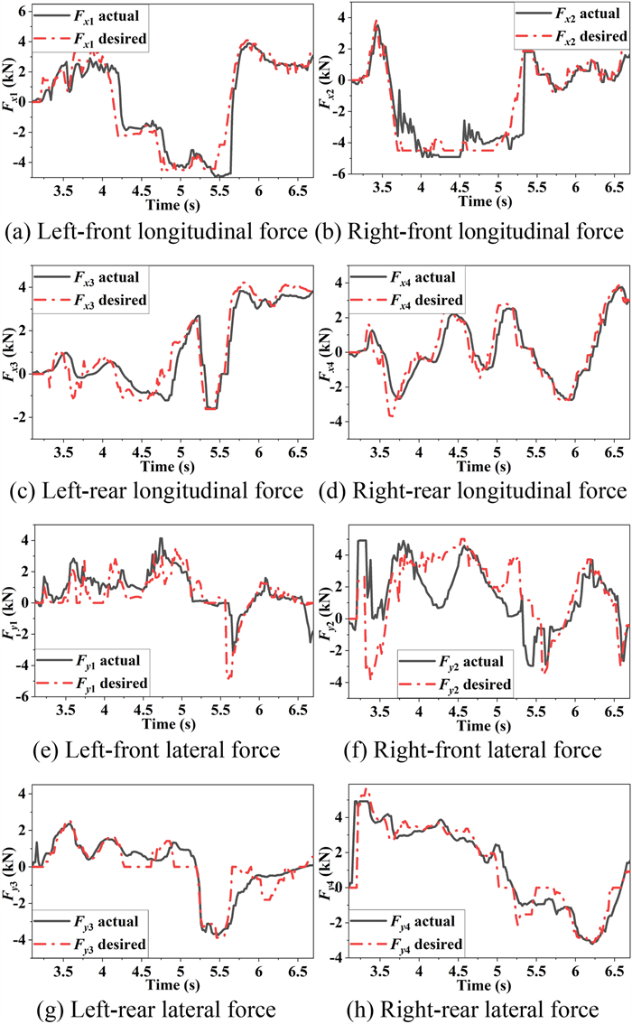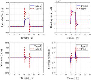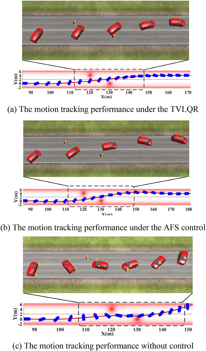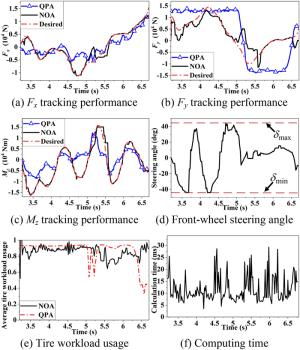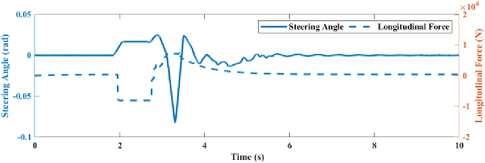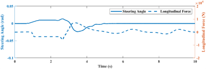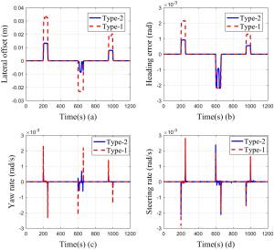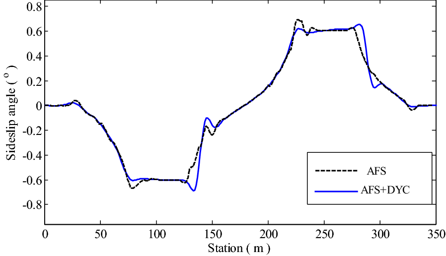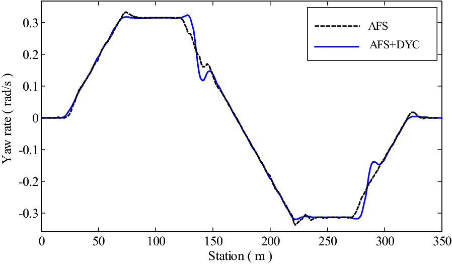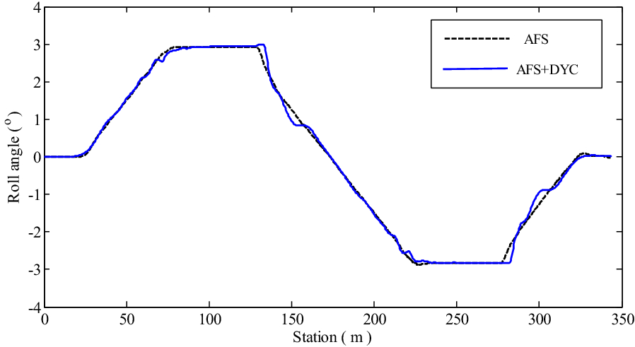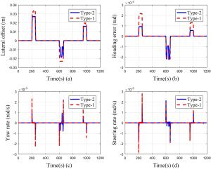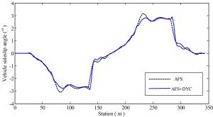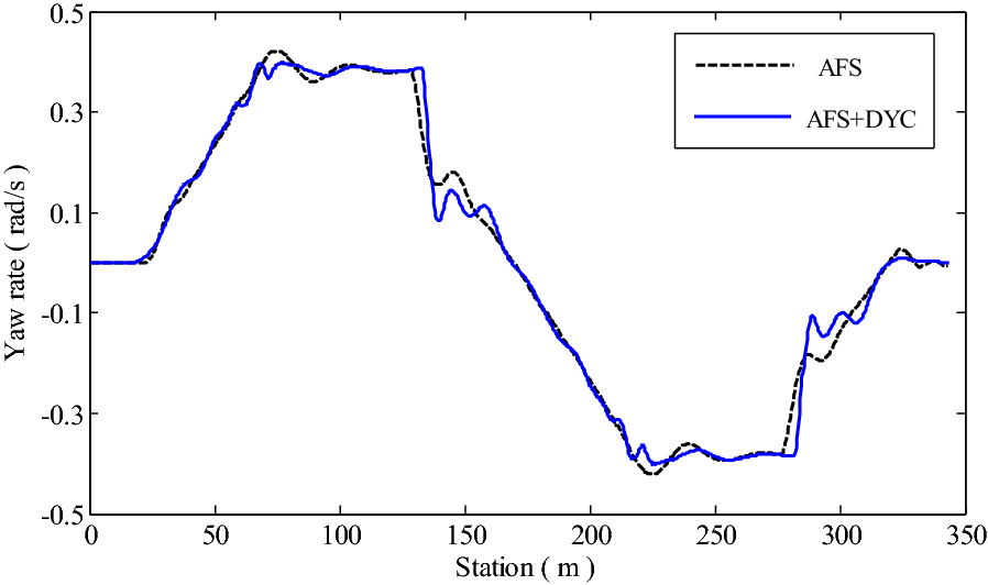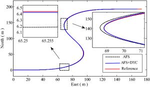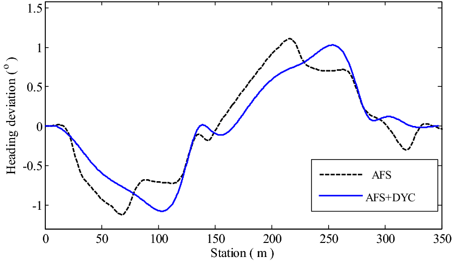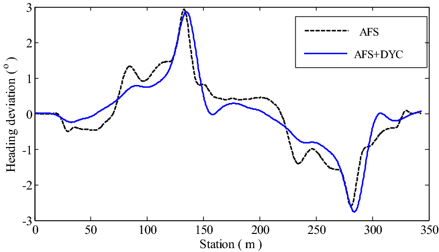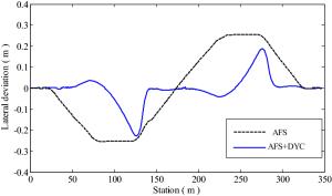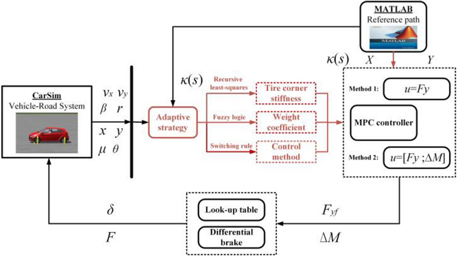It is a striking fact that the path tracking accuracy of autonomous vehicles based on active front wheel steering is poor under high-speed and large-curvature conditions. In this study, an adaptive path tracking control strategy that coordinates active front wheel steering and direct yaw moment is proposed based on model predictive control algorithm. The recursive least square method with a forgetting factor is used to identify the rear tire cornering stiffness and update the path tracking system prediction model. To adaptively adjust the priorities of path tracking accuracy and vehicle stability, an adaptive strategy based on fuzzy rules is applied to change the weight coefficients in the cost function. An adaptive control strategy for coordinating active front steering and direct yaw moment is proposed to improve the path tracking accuracy under high-speed and large-curvature conditions. To ensure vehicle stability, the sideslip angle, yaw rate and zero moment methods are used to construct optimization constraints based on the model predictive control frame. It is verified through simulation experiments that the proposed adaptive coordinated control strategy can improve the path tracking accuracy and ensure vehicle stability under high-speed and large-curvature conditions.