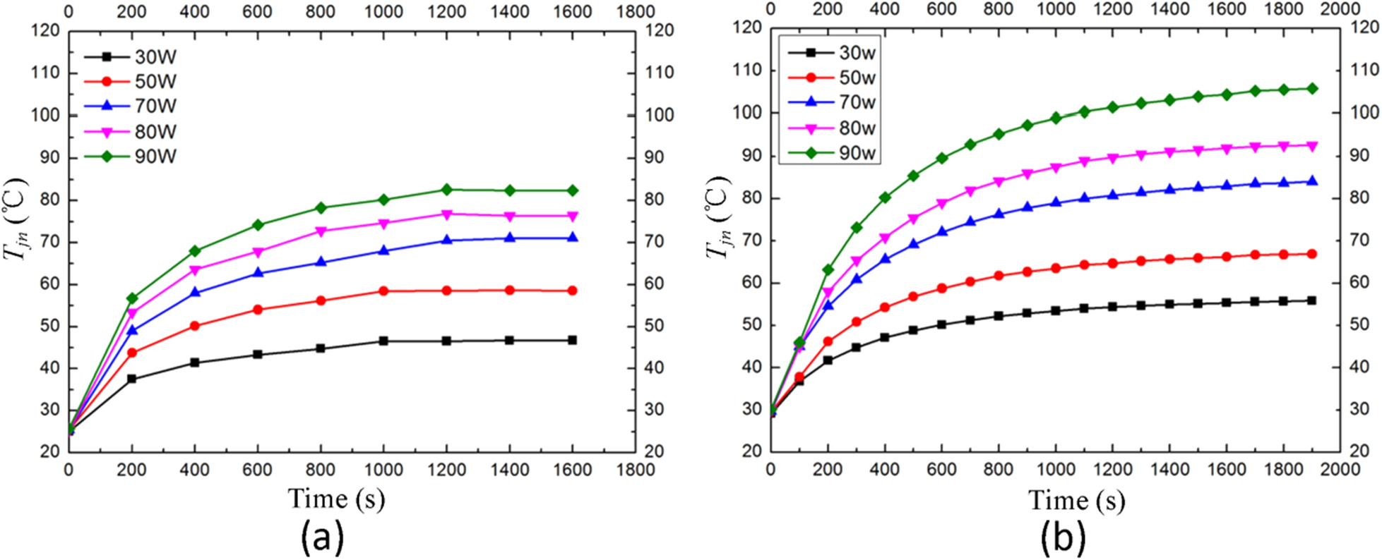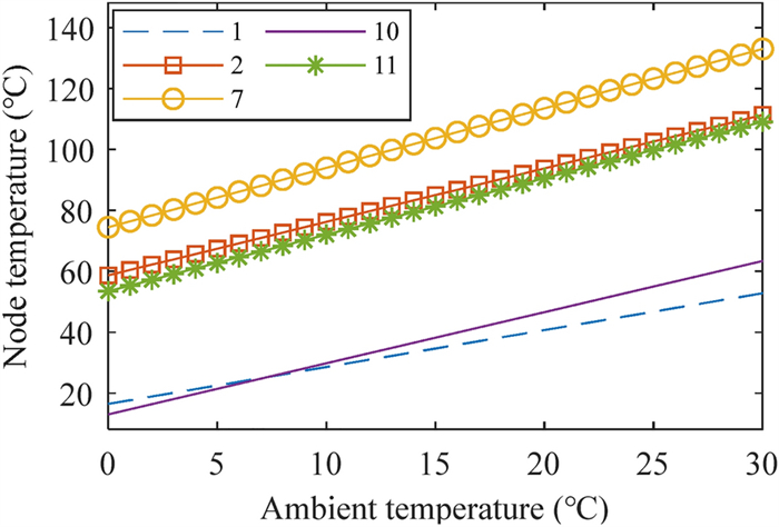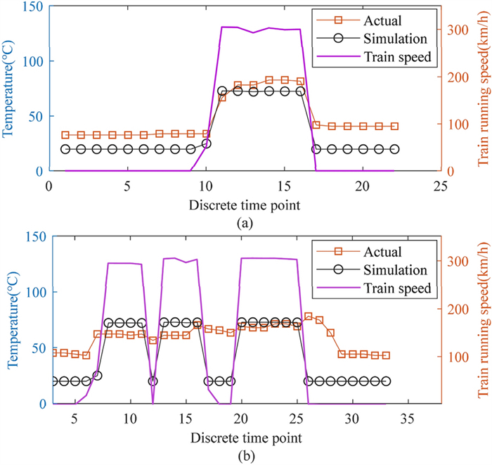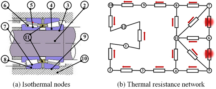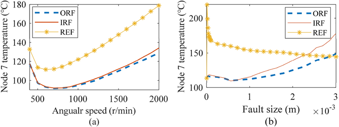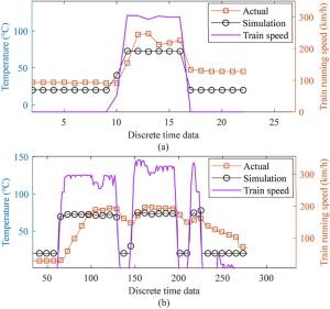 High-speed trains often use temperature sensors to monitor the motion state of bearings. However, the temperature of bearings can be affected by factors such as weather and faults. Therefore, it is necessary to analyze in detail the relationship between the bearing temperature and influencing factors. In this study, a dynamics model of the axle box bearing of high-speed trains is established. The model can obtain the contact force between the rollers and raceway and its change law when the bearing contains outer-ring, inner-ring, and rolling-element faults. Based on the model, a thermal network method is introduced to study the temperature field distribution of the axle box bearings of high-speed trains. In this model, the heat generation, conduction, and dispersion of the isothermal nodes can be solved. The results show that the temperature of the contact point between the outer-ring raceway and rolling-elements is the highest. The relationships between the node temperature and the speed, fault type, and fault size are analyzed, finding that the higher the speed, the higher the node temperature. Under different fault types, the node temperature first increases and then decreases as the fault size increases. The effectiveness of the model is demonstrated using the actual temperature data of a high-speed train. This study proposes a thermal network model that can predict the temperature of each component of the bearings on a high-speed train under various speed and fault conditions.