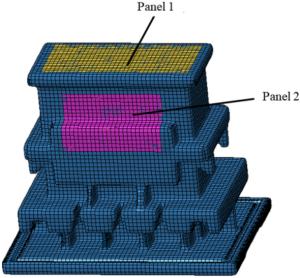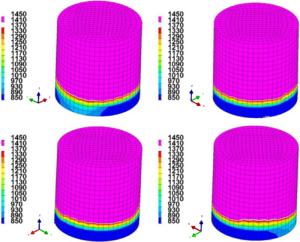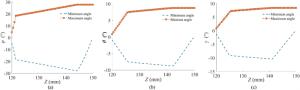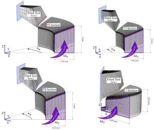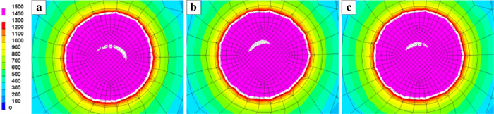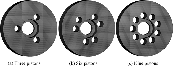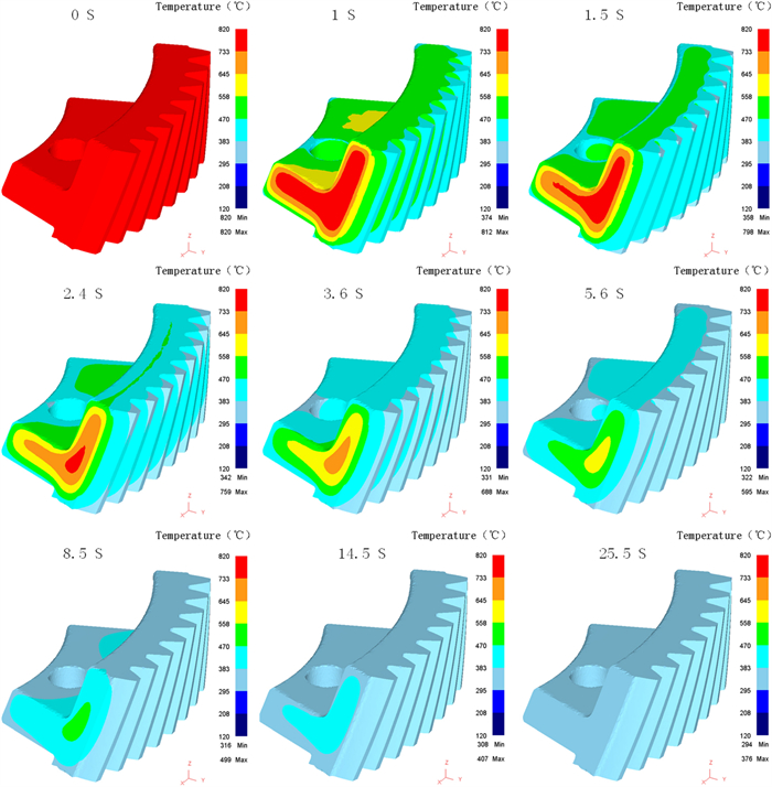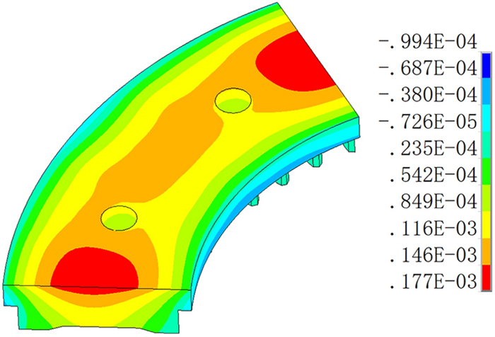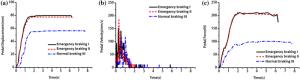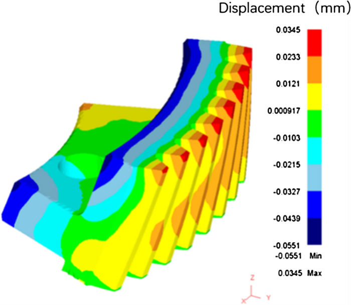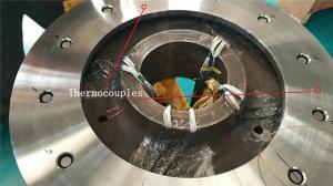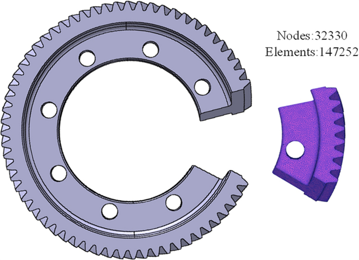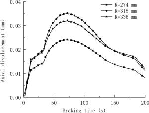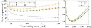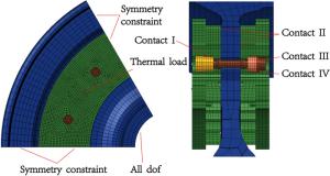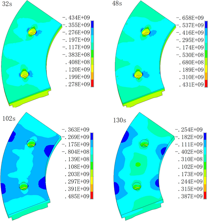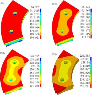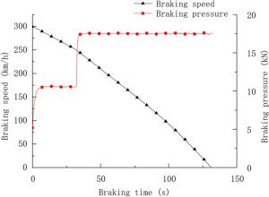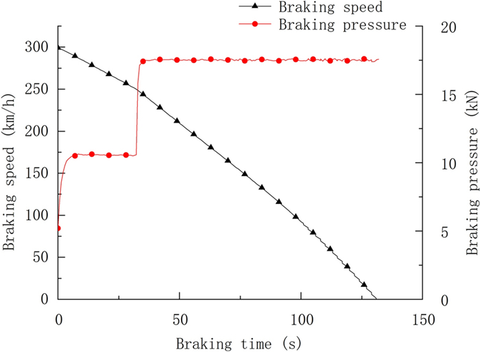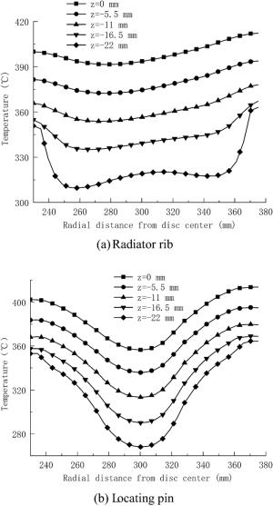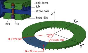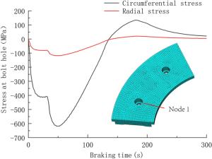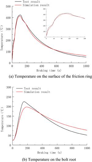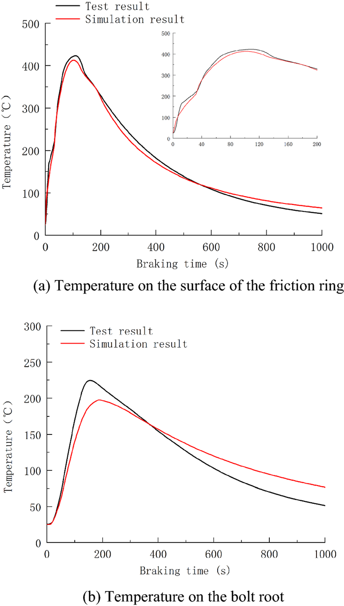 During the braking process, a large amount of heat energy is generated at the friction surfaces between the brake disc and pads and rapidly dissipates into the disc volume. In this paper, a three-dimensional thermo-mechanical coupling model of high-speed wheel-mounted brake discs containing bolted joints and contact relationships is established. The direct coupling method is used to analyze the temperature and stress of the brake discs during an emergency braking event with an initial speed of 300 km/h. A full-scale bench test is also conducted to monitor the temperatures of the friction ring and bolted joints. The simulation result shows that the surface temperature of the friction ring reaches its peak value of 414 ℃ after 102 s of braking, which agrees well with the bench test result. The maximum alternating thermal stress occurs in the bolt hole where the maximum circumferential compressive stress is −658 MPa and the maximum circumferential tensile stress is 134 MPa. During the braking process, the out-of-plane deformation of the middle part of the friction ring is larger than that of the edge, which increases the axial tensile load of the connecting bolt. This work provides support for the design of brake discs and connecting bolts.