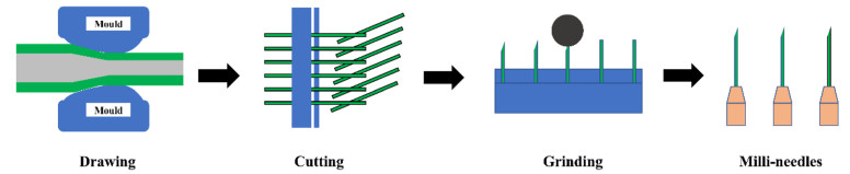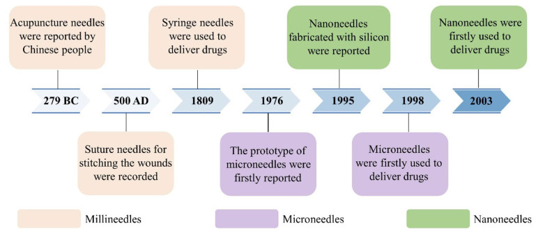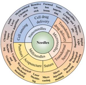 Needles, as some of the most widely used medical devices, have been effectively applied in human disease prevention, diagnosis, treatment, and rehabilitation. Thin 1D needle can easily penetrate cells/organs by generating highly localized stress with their sharp tips to achieve bioliquid sampling, biosensing, drug delivery, surgery, and other such applications. In this review, we provide an overview of multiscale needle fabrication techniques and their biomedical applications. Needles are classified as nanoneedles, microneedles and millineedles based on the needle diameter, and their fabrication techniques are highlighted. Nanoneedles bridge the inside and outside of cells, achieving intracellular electrical recording, biochemical sensing, and drug delivery. Microneedles penetrate the stratum corneum layer to detect biomarkers/bioelectricity in interstitial fluid and deliver drugs through the skin into the human circulatory system. Millineedles, including puncture, syringe, acupuncture and suture needles, are presented. Finally, conclusions and future perspectives for next-generation nano/micro/milli needles are discussed.