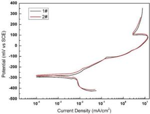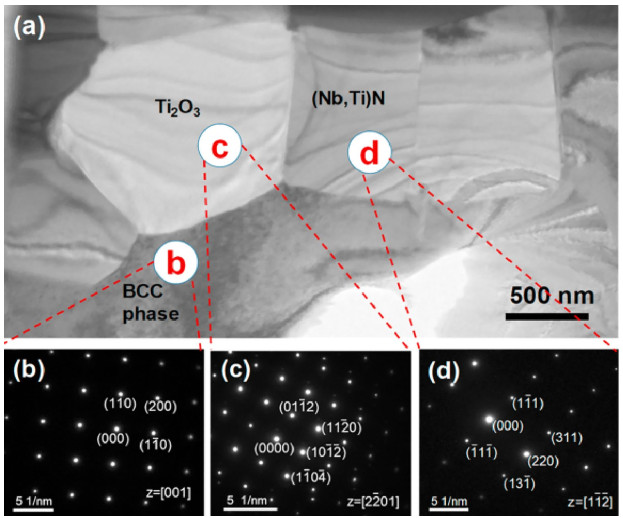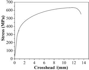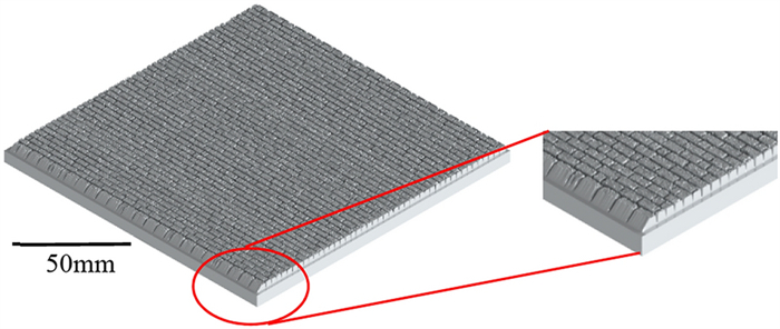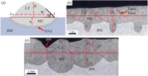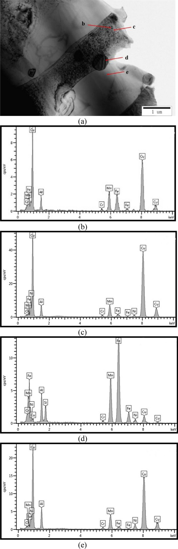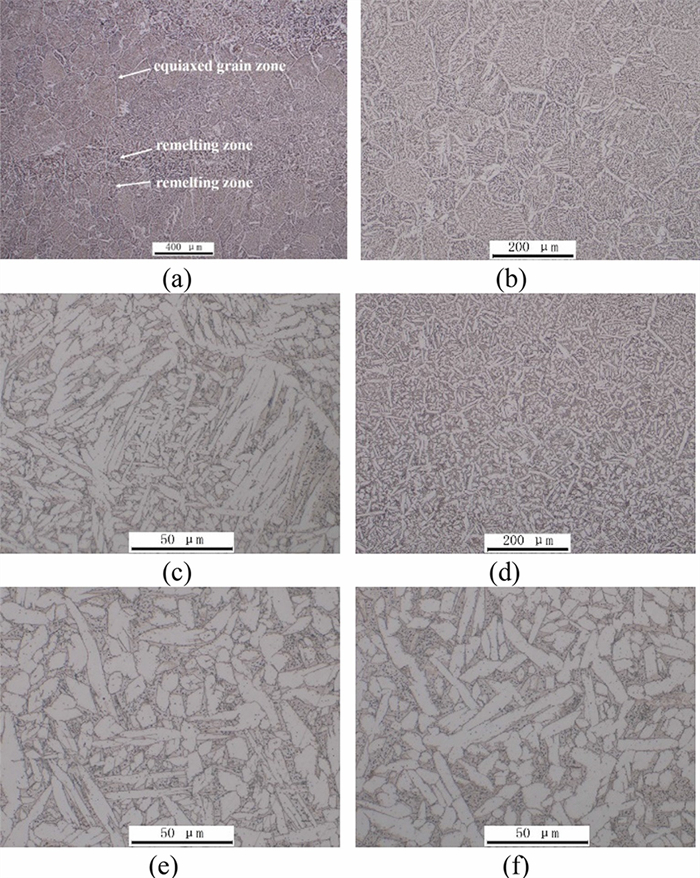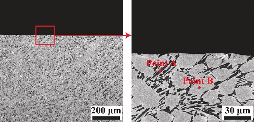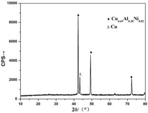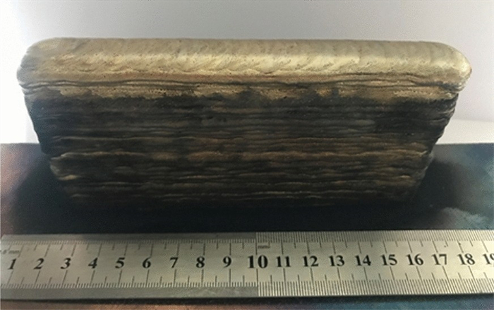 In this work, high-manganese aluminium bronze CuMn13Al7 samples were prepared by arc additive manufacturing technology. The phase composition, microstructure, and crystal structure of the high-manganese aluminium bronze CuMn13Al7 arc additive manufactured samples were analysed using direct-reading spectrometer, metallographic microscope, scanning electron microscope, and transmission electron microscope. The micro-hardness tester, tensile tester, impact tester, and electrochemical workstation were also used to test the performance of the CuMn13Al7 samples. By studying the microstructure and properties of the CuMn13Al7 samples, it was found that preparation of the samples by the arc additive manufacturing technology ensured good forming quality, almost no defects, and good metallurgical bonding inside the sample. The metallographic structure (α + β + point phase) mainly comprises the following: the metallographic structure in the equiaxed grain region has an obvious grain boundary α; the metallographic structure in the remelting region has no obvious grain boundary α; the thermal influence on the metallographic structure produced a weaker grain boundary α than the equiaxed grain region. The transverse and longitudinal cross sections of the sample had uniform microhardness distributions, and the average microhardness values were 190.5 HV0.1 and 192.7 HV0.1, respectively. The sample also had excellent mechanical properties: yield strength of 301 MPa, tensile strength of 633 MPa, elongation of 43.5%, reduction of area by 58%, Charpy impact value of 68 J/cm2 at – 20 ℃, and dynamic potential polarisation curve test results. Further, it was shown that the average corrosion potential of the sample was – 284.5 mV, and the average corrosion current density was 4.1×10–3 mA/cm2.