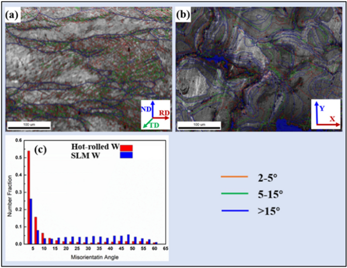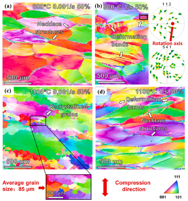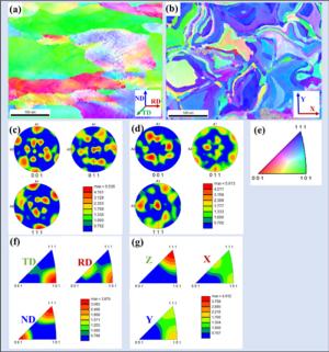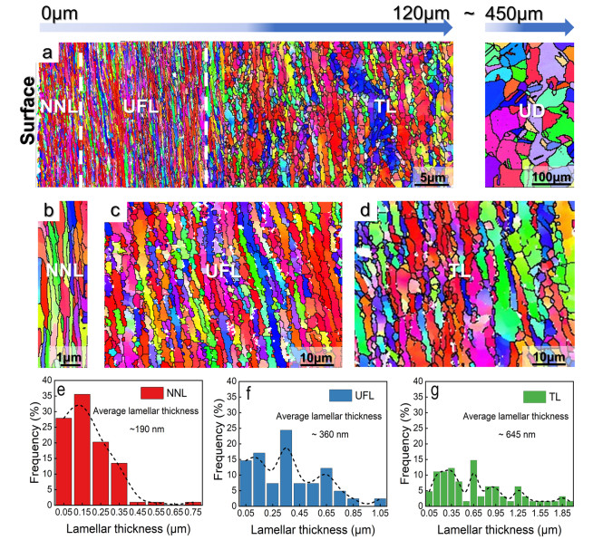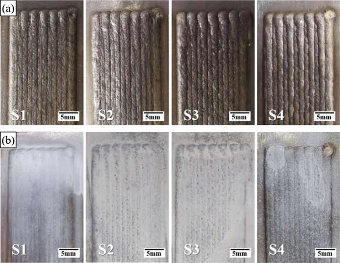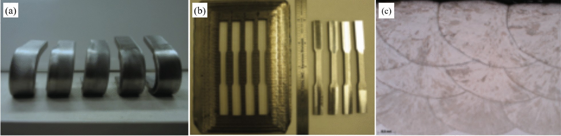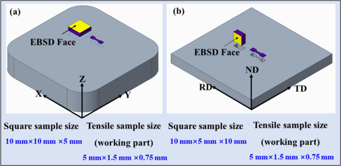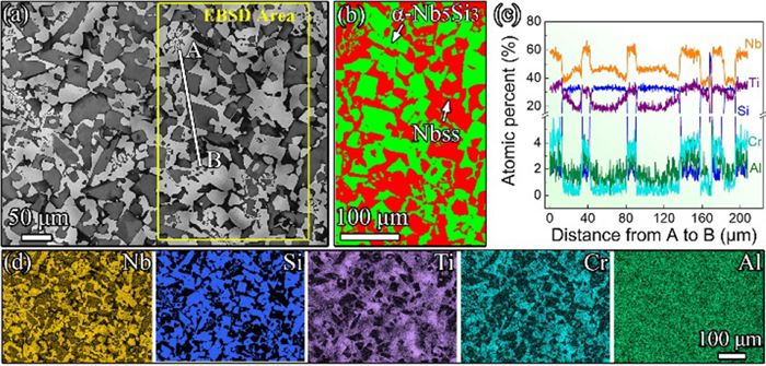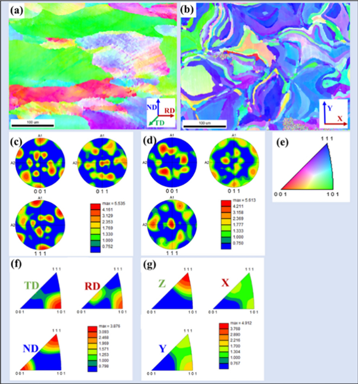 In this work, high-manganese aluminium bronze CuMn13Al7 samples were prepared by arc additive manufacturing technology. The phase composition, microstructure, and crystal structure of the high-manganese aluminium bronze CuMn13Al7 arc additive manufactured samples were analysed using direct-reading spectrometer, metallographic microscope, scanning electron microscope, and transmission electron microscope. The micro-hardness tester, tensile tester, impact tester, and electrochemical workstation were also used to test the performance of the CuMn13Al7 samples. By studying the microstructure and properties of the CuMn13Al7 samples, it was found that preparation of the samples by the arc additive manufacturing technology ensured good forming quality, almost no defects, and good metallurgical bonding inside the sample. The metallographic structure (α + β + point phase) mainly comprises the following: the metallographic structure in the equiaxed grain region has an obvious grain boundary α; the metallographic structure in the remelting region has no obvious grain boundary α; the thermal influence on the metallographic structure produced a weaker grain boundary α than the equiaxed grain region. The transverse and longitudinal cross sections of the sample had uniform microhardness distributions, and the average microhardness values were 190.5 HV0.1 and 192.7 HV0.1, respectively. The sample also had excellent mechanical properties: yield strength of 301 MPa, tensile strength of 633 MPa, elongation of 43.5%, reduction of area by 58%, Charpy impact value of 68 J/cm2 at – 20 ℃, and dynamic potential polarisation curve test results. Further, it was shown that the average corrosion potential of the sample was – 284.5 mV, and the average corrosion current density was 4.1×10–3 mA/cm2.