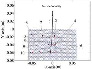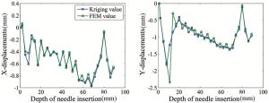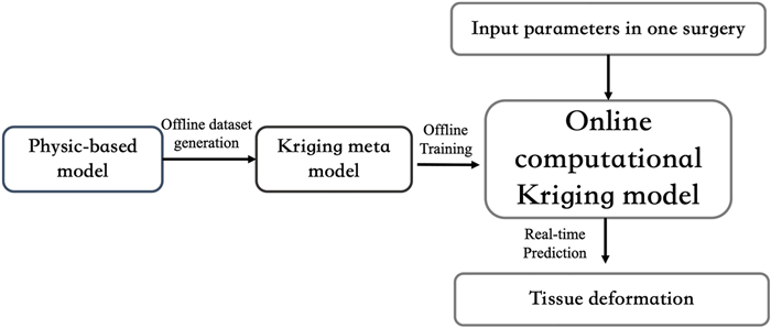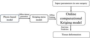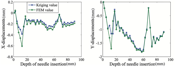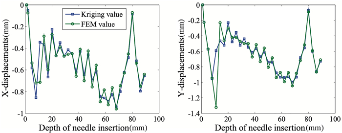 The simulation and planning system (SPS) requires accurate and real-time feedback regarding the deformation of soft tissues during the needle insertion procedure. Traditional mechanical-based models such as the finite element method (FEM) are widely used to compute the deformations of soft tissue. However, it is difficult for the FEM or other methods to find a balance between an acceptable image fidelity and real-time deformation feedback due to their complex material properties, geometries and interaction mechanisms. In this paper, a Kriging-based method is applied to model the soft tissue deformation to strike a balance between the accuracy and efficiency of deformation feedback. Four combinations of regression and correlation functions are compared regarding their ability to predict the maximum deformations of ten characteristic markers at a fixed insertion depth. The results suggest that a first order regression function with Gaussian correlation functions can best fit the results of the ground truth. The functional response of the Kriging-based method is utilized to model the dynamic deformations of markers at a series of needle insertion depths. The feasibility of the method is verified by investigating the adaptation to step variations. Compared with the ground truth of the finite element (FE) results, the maximum residual is less than 0.92 mm in the Y direction and 0.31 mm in the X direction. The results suggest that the Kriging metamodel provides real-time deformation feedback for a target and an obstacle to a SPS.