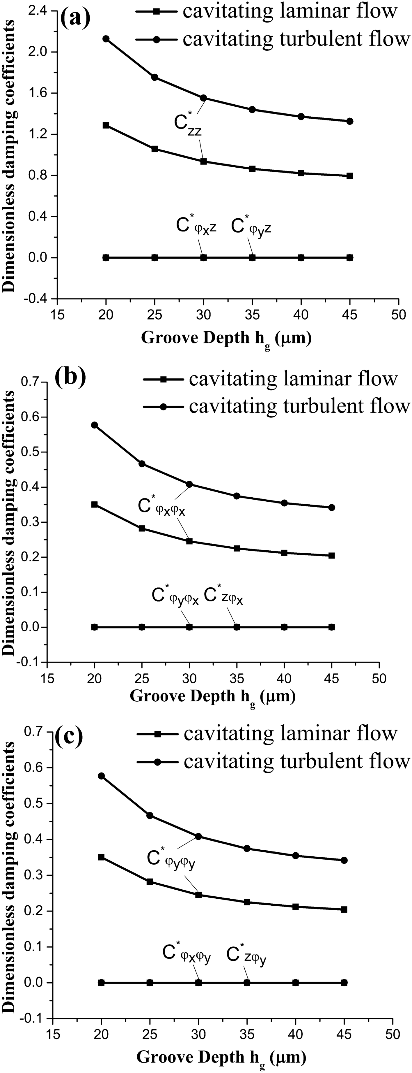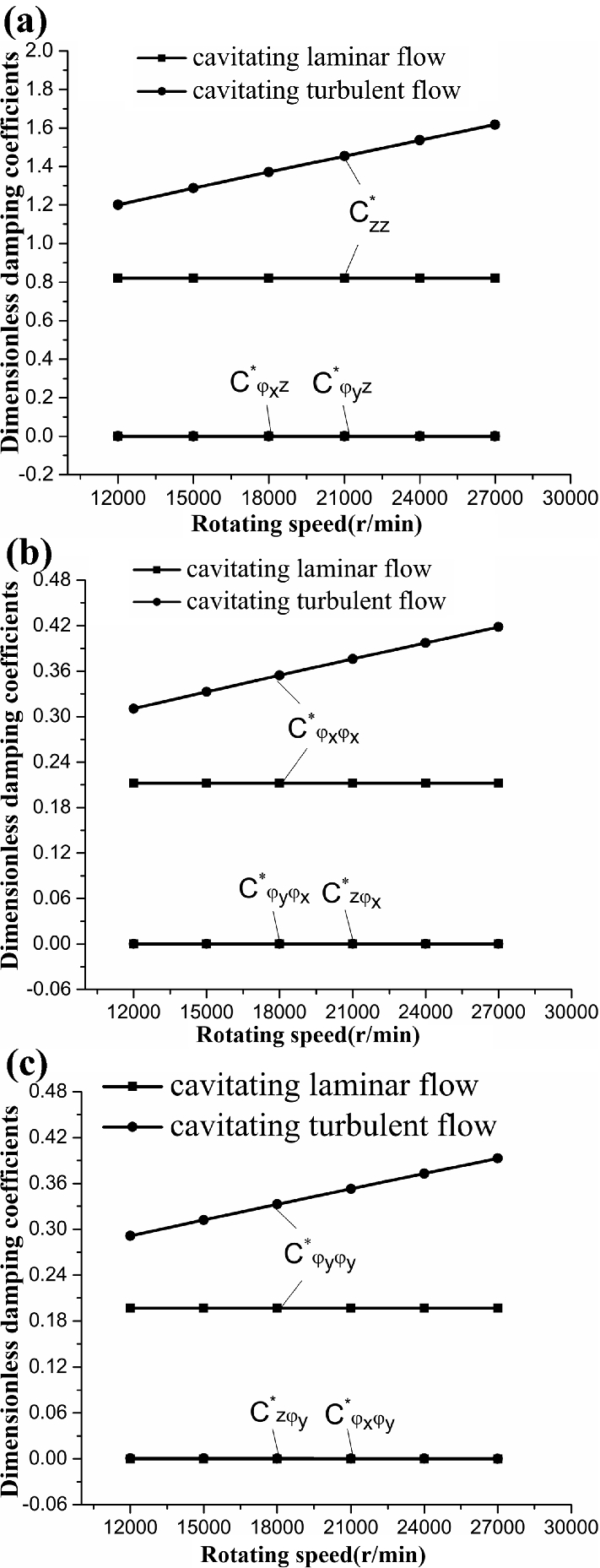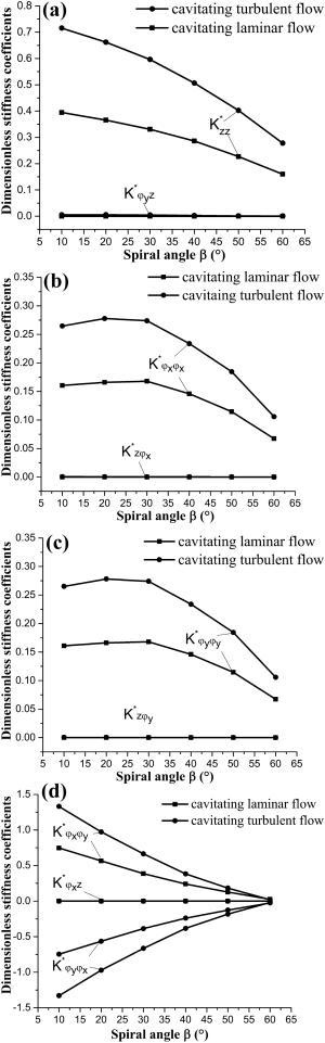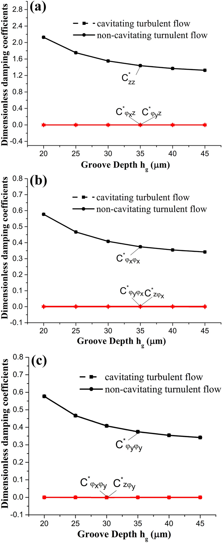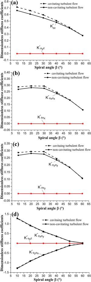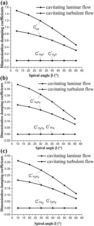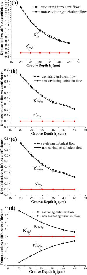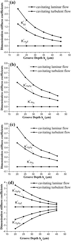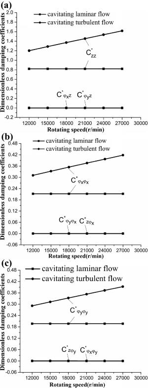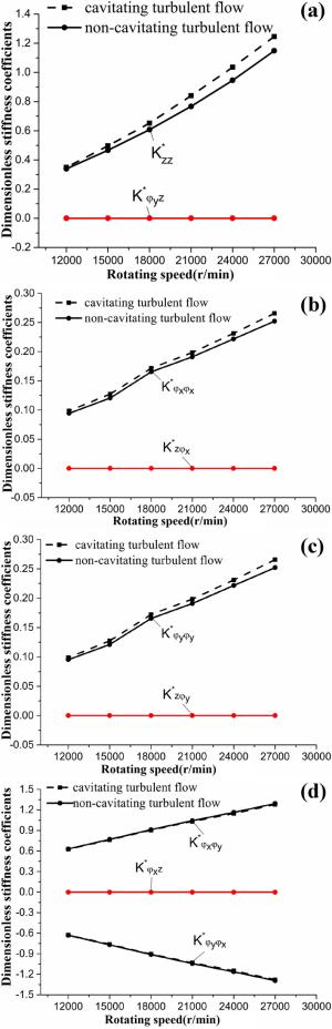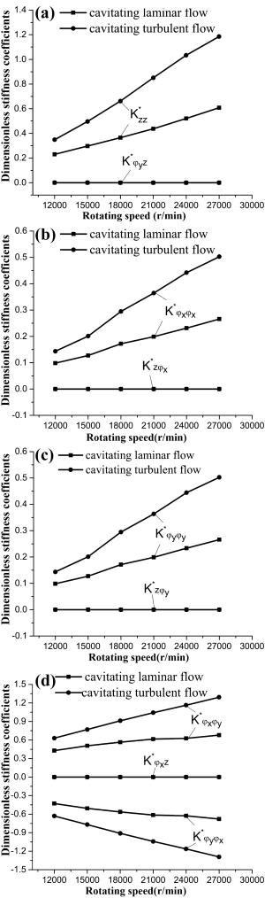 The water-lubricated bearings are usually the state of turbulent cavitating flow under high-speed conditions. And the distribution of cavitation bubbles and the interface effect between the two phases have not been included in previous studies on high-speed water-lubricated bearings. In order to study the influence of interface effect and cavitation bubble distribution on the dynamic characteristics of high-speed water-lubricated spiral groove thrust bearings (SGTB).A turbulent cavitating flow lubrication model based on two-phase fluid and population balance equation of bubbles was established in this paper. Stiffness and the damping coefficients of the SGTB were calculated using the perturbation pressure equations. An experimental apparatus was developed to verify the theoretical model. Simulating and experimental results show that the small-sized bubbles tend to generate in the turbulent cavitating flow when at a high rotary speed, and the bubbles mainly locate at the edges of the spiral groove. The simulating results also show that the direct stiffness coefficients are increased due to cavitation effect, and cross stiffness coefficients and damping coefficients are hardly affected by the cavitation effect. Turbulent effect on the dynamic characteristics of SGTB is much stronger than the cavitating effect
