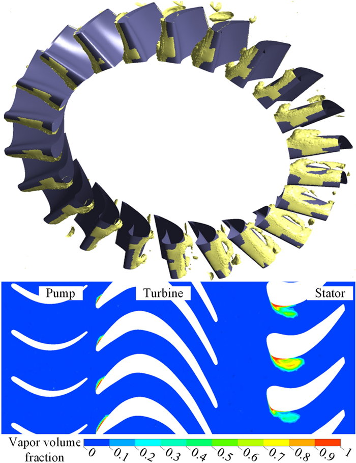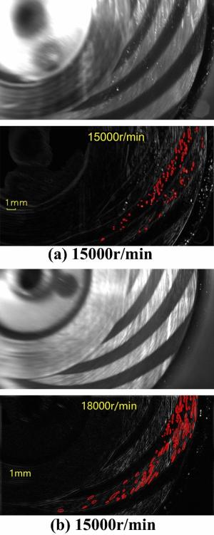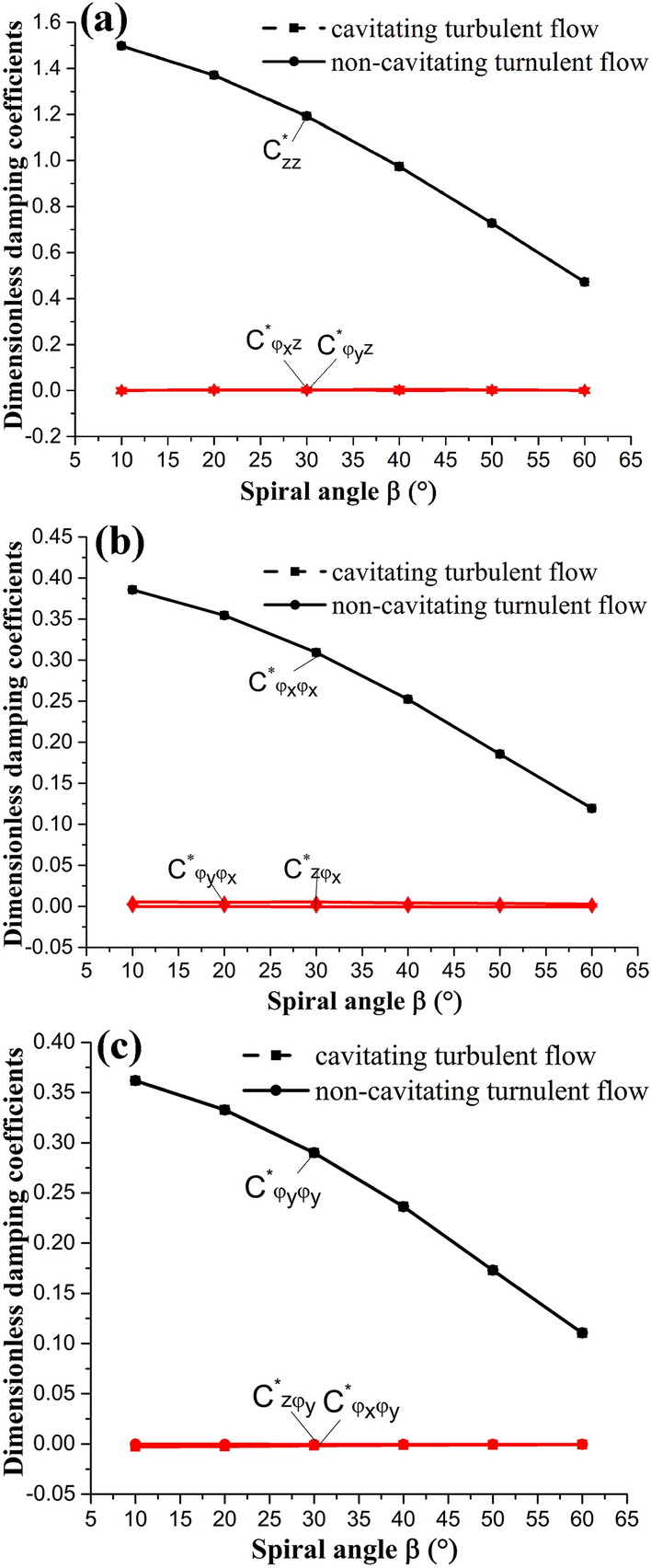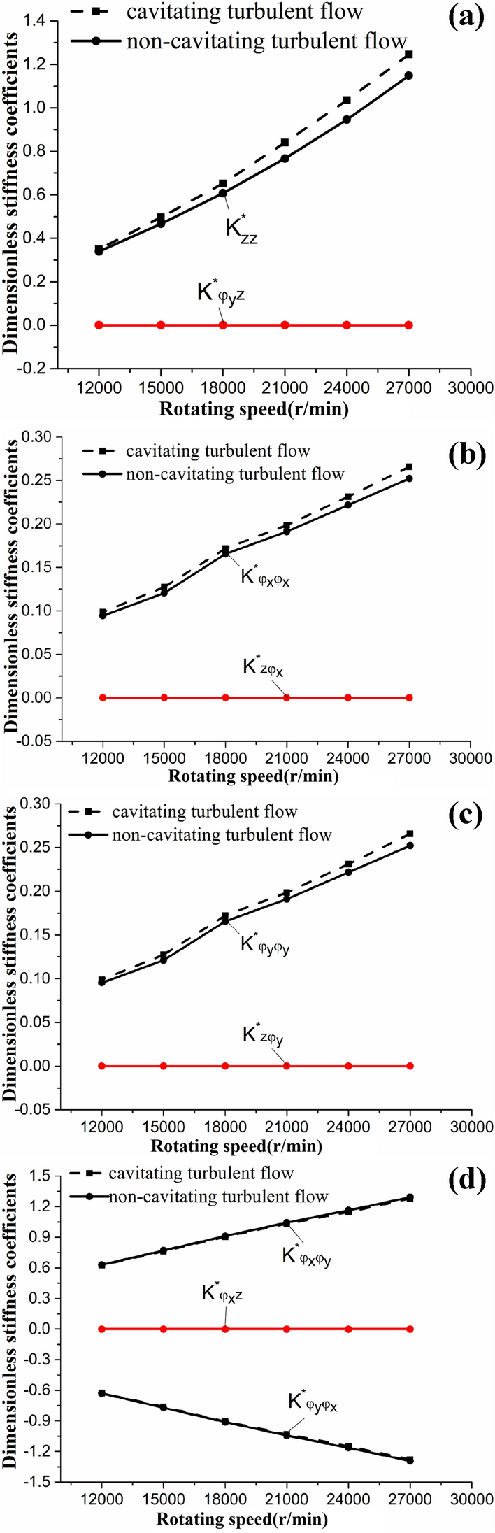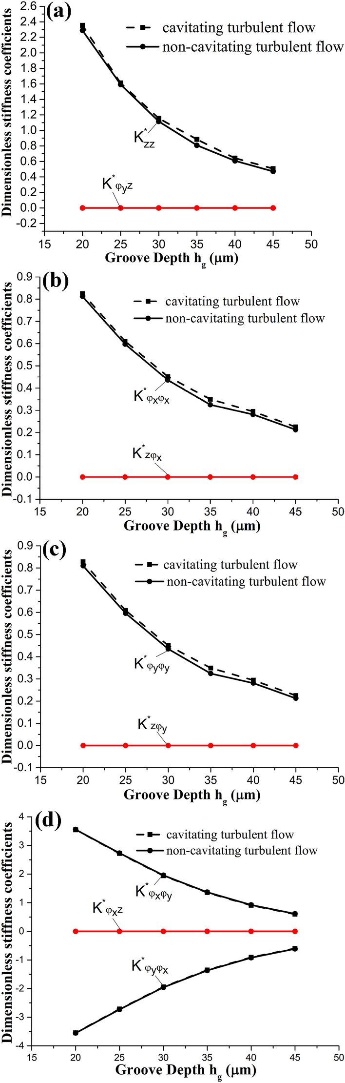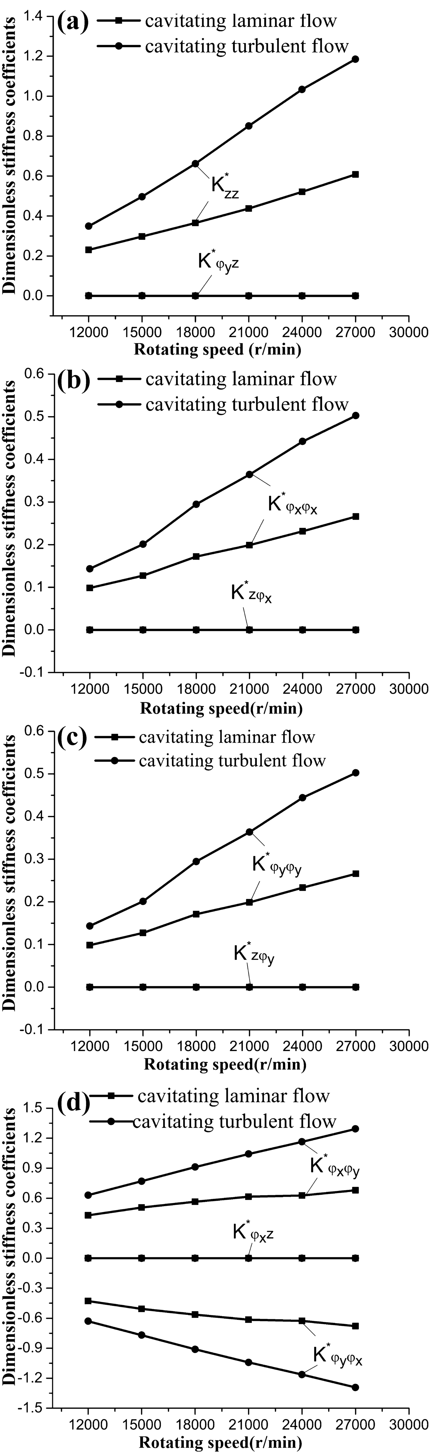 The water-lubricated bearings are usually the state of turbulent cavitating flow under high-speed conditions. And the distribution of cavitation bubbles and the interface effect between the two phases have not been included in previous studies on high-speed water-lubricated bearings. In order to study the influence of interface effect and cavitation bubble distribution on the dynamic characteristics of high-speed water-lubricated spiral groove thrust bearings (SGTB).A turbulent cavitating flow lubrication model based on two-phase fluid and population balance equation of bubbles was established in this paper. Stiffness and the damping coefficients of the SGTB were calculated using the perturbation pressure equations. An experimental apparatus was developed to verify the theoretical model. Simulating and experimental results show that the small-sized bubbles tend to generate in the turbulent cavitating flow when at a high rotary speed, and the bubbles mainly locate at the edges of the spiral groove. The simulating results also show that the direct stiffness coefficients are increased due to cavitation effect, and cross stiffness coefficients and damping coefficients are hardly affected by the cavitation effect. Turbulent effect on the dynamic characteristics of SGTB is much stronger than the cavitating effect