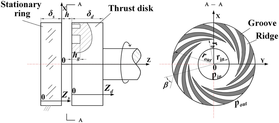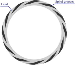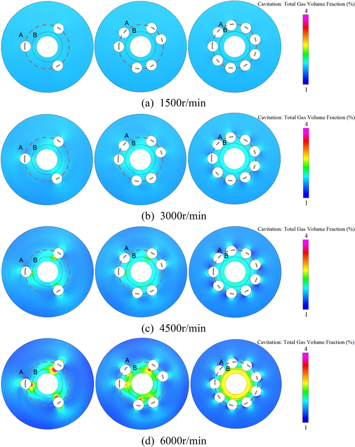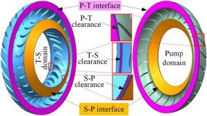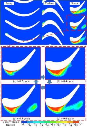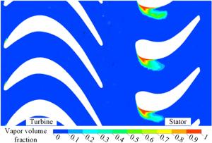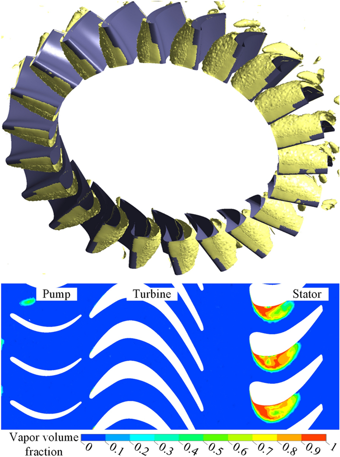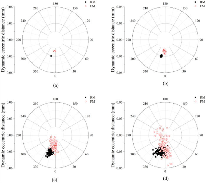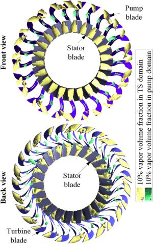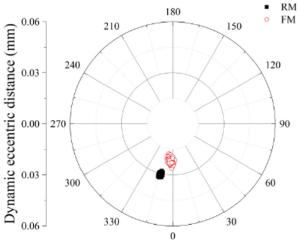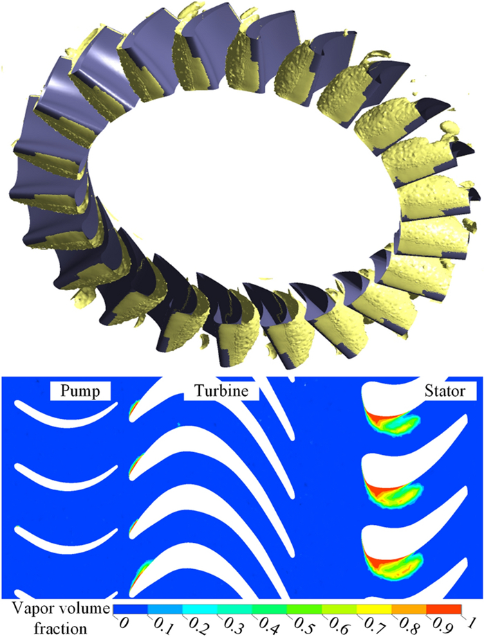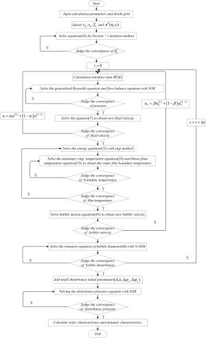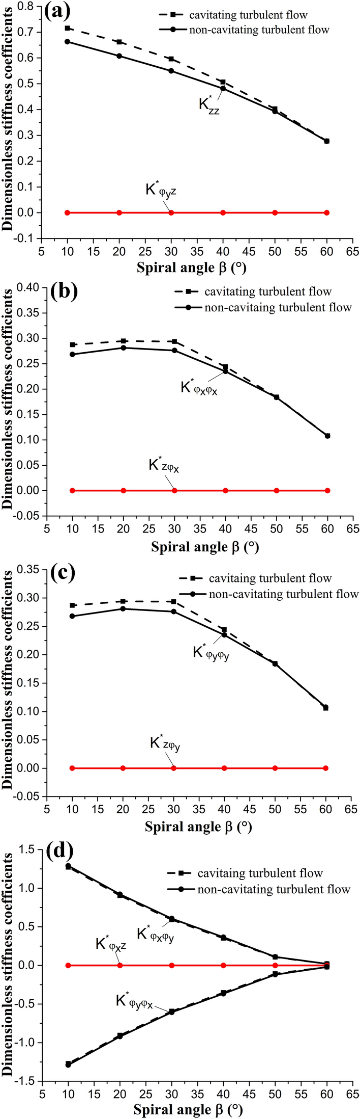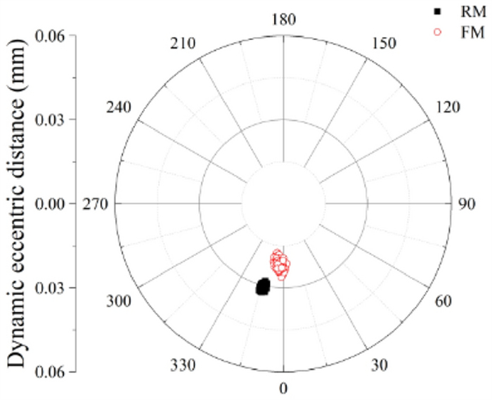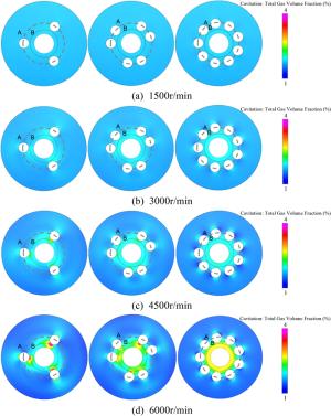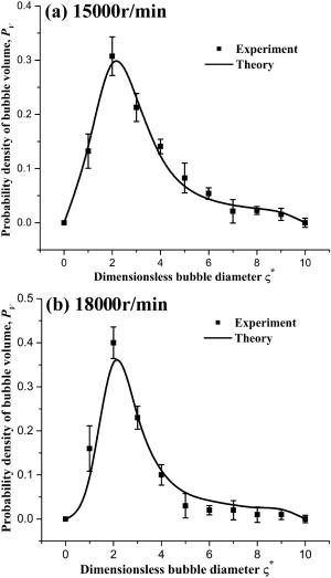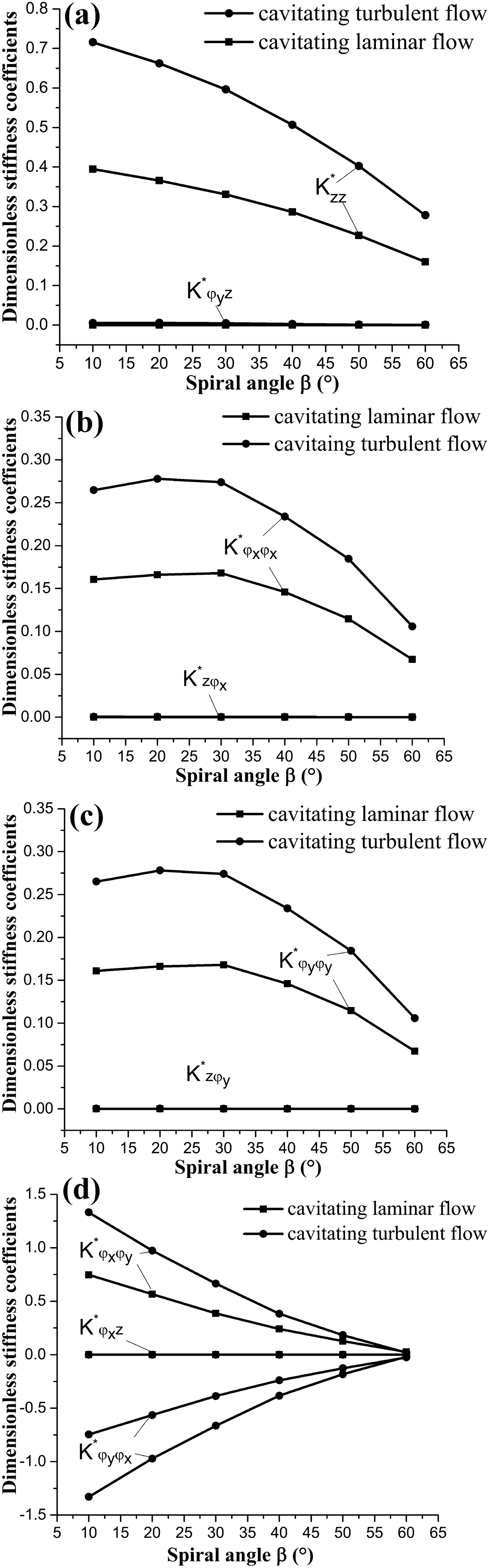 The water-lubricated bearings are usually the state of turbulent cavitating flow under high-speed conditions. And the distribution of cavitation bubbles and the interface effect between the two phases have not been included in previous studies on high-speed water-lubricated bearings. In order to study the influence of interface effect and cavitation bubble distribution on the dynamic characteristics of high-speed water-lubricated spiral groove thrust bearings (SGTB).A turbulent cavitating flow lubrication model based on two-phase fluid and population balance equation of bubbles was established in this paper. Stiffness and the damping coefficients of the SGTB were calculated using the perturbation pressure equations. An experimental apparatus was developed to verify the theoretical model. Simulating and experimental results show that the small-sized bubbles tend to generate in the turbulent cavitating flow when at a high rotary speed, and the bubbles mainly locate at the edges of the spiral groove. The simulating results also show that the direct stiffness coefficients are increased due to cavitation effect, and cross stiffness coefficients and damping coefficients are hardly affected by the cavitation effect. Turbulent effect on the dynamic characteristics of SGTB is much stronger than the cavitating effect