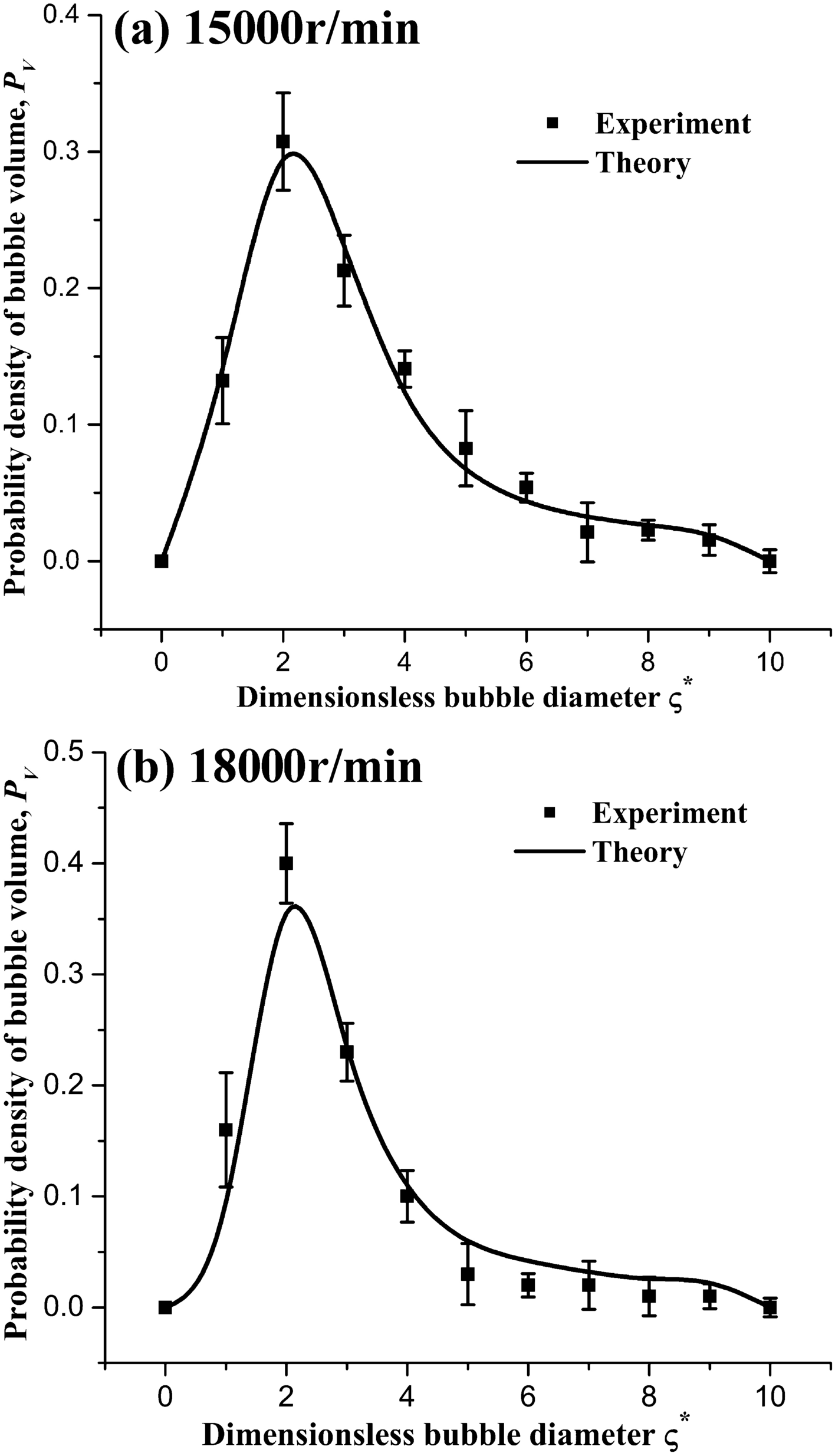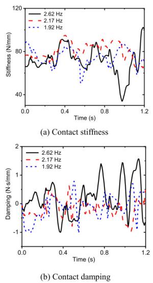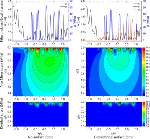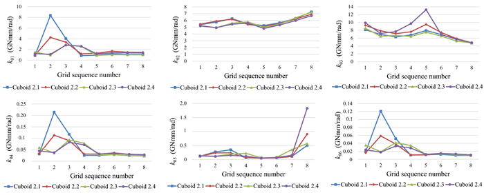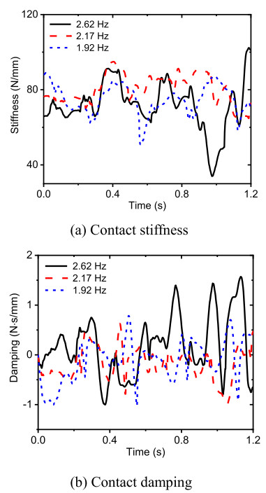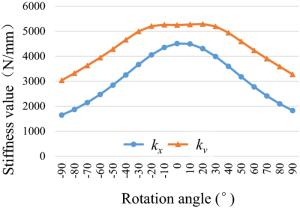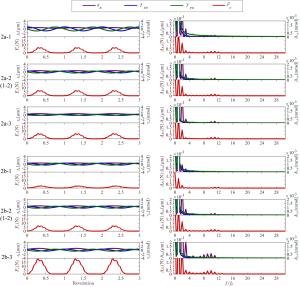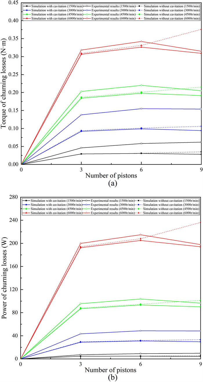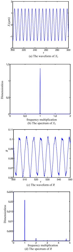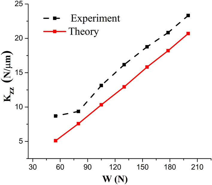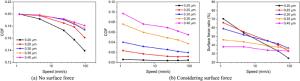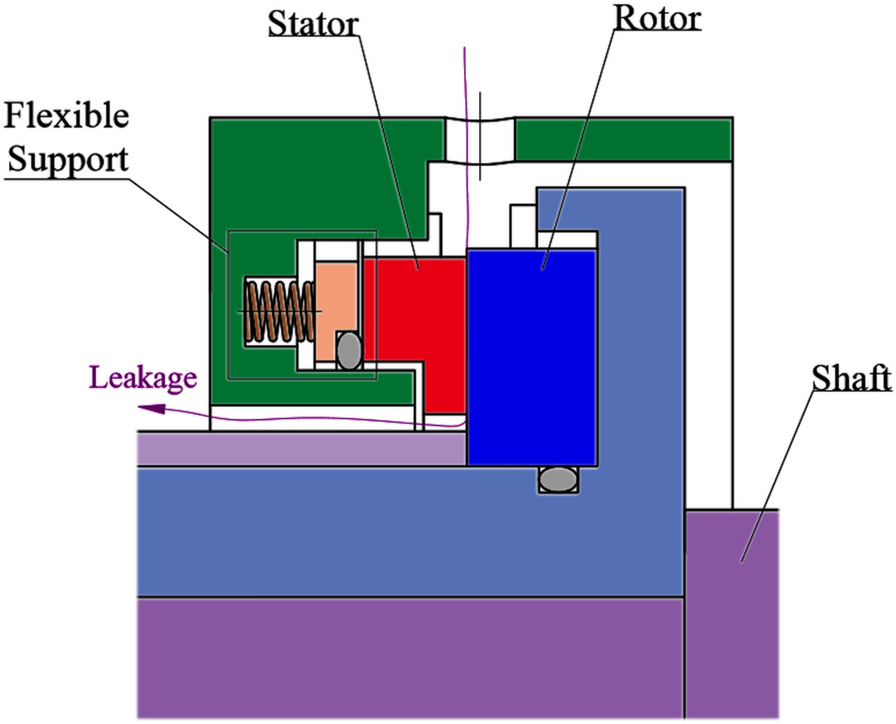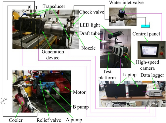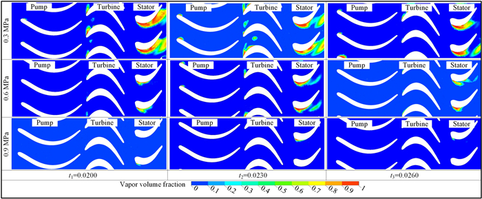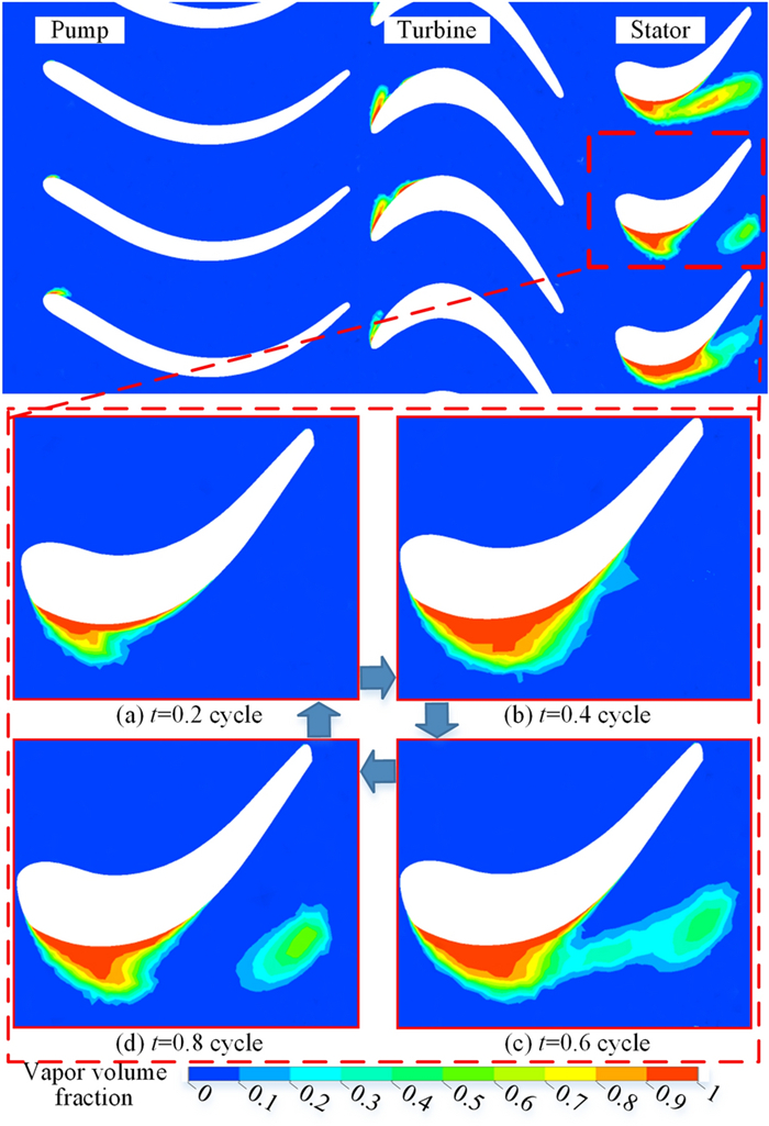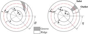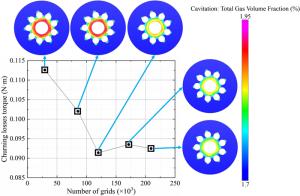 The water-lubricated bearings are usually the state of turbulent cavitating flow under high-speed conditions. And the distribution of cavitation bubbles and the interface effect between the two phases have not been included in previous studies on high-speed water-lubricated bearings. In order to study the influence of interface effect and cavitation bubble distribution on the dynamic characteristics of high-speed water-lubricated spiral groove thrust bearings (SGTB).A turbulent cavitating flow lubrication model based on two-phase fluid and population balance equation of bubbles was established in this paper. Stiffness and the damping coefficients of the SGTB were calculated using the perturbation pressure equations. An experimental apparatus was developed to verify the theoretical model. Simulating and experimental results show that the small-sized bubbles tend to generate in the turbulent cavitating flow when at a high rotary speed, and the bubbles mainly locate at the edges of the spiral groove. The simulating results also show that the direct stiffness coefficients are increased due to cavitation effect, and cross stiffness coefficients and damping coefficients are hardly affected by the cavitation effect. Turbulent effect on the dynamic characteristics of SGTB is much stronger than the cavitating effect