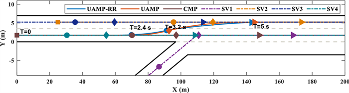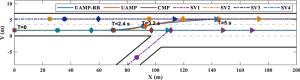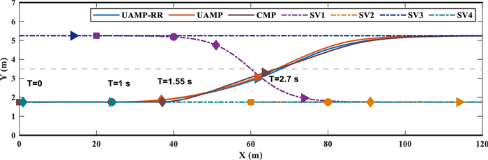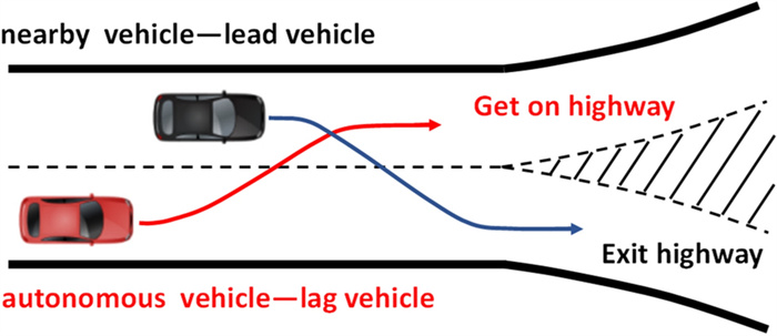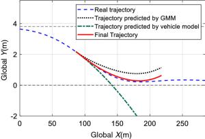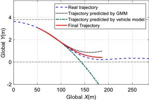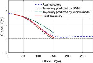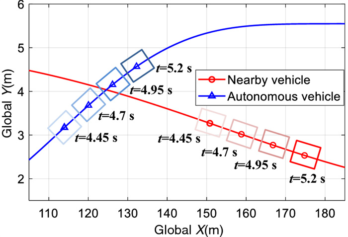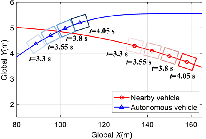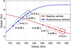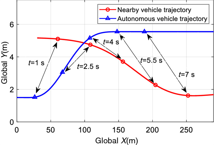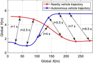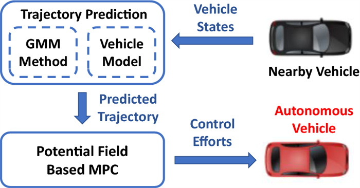The cooperation between an autonomous vehicle and a nearby vehicle is critical to ensure driving safety in the lane-exchanging scenario. The nearby vehicle trajectory needs to be predicted, from which the autonomous vehicle is controlled to prevent possible collisions. This paper proposes a lane-exchanging driving strategy for the autonomous vehicle to cooperate with the nearby vehicle by integrating vehicle trajectory prediction and motion control. A trajectory prediction method is developed to anticipate the nearby vehicle trajectory. The Gaussian mixture model (GMM), together with the vehicle kinematic model, are synthesized to predict the nearby vehicle trajectory. A potential-field-based model predictive control (MPC) approach is utilized by the autonomous vehicle to conduct the lane-exchanging maneuver. The potential field of the nearby vehicle is considered in the controller design for collision avoidance. On-road driving data verification shows that the nearby vehicle trajectory can be predicted by the proposed method. CarSim® simulations validate that the autonomous vehicle can perform the lane-exchanging maneuver and avoid the nearby vehicle using the proposed driving strategy. The autonomous vehicle can thus safely perform the lane-exchanging maneuver and avoid the nearby vehicle.
