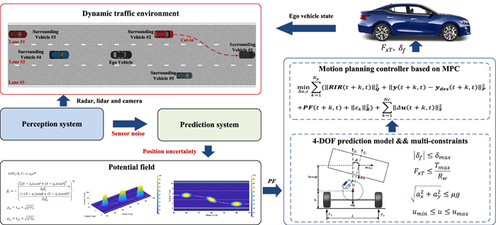 Autonomous vehicles require safe motion planning in uncertain environments, which are largely caused by surrounding vehicles. In this paper, a driving environment uncertainty-aware motion planning framework is proposed to lower the risk of position uncertainty of surrounding vehicles with considering the risk of rollover. First, a 4-degree of freedom vehicle dynamics model, and a rollover risk index are introduced. Besides, the uncertainty of surrounding vehicles' position is processed and propagated based on the Extended Kalman Filter method. Then, the uncertainty potential field is established to handle the position uncertainty of autonomous vehicles. In addition, the model predictive controller is designed as the motion planning framework which accounts for the rollover risk, the position uncertainty of the surrounding vehicles, and vehicle dynamic constraints of autonomous vehicles. Furthermore, two edge cases, the cut-in scenario, and merging scenario are designed. Finally, the safety, effectiveness, and real-time performance of the proposed motion planning framework are demonstrated by employing a hardware-in-the-loop experiment bench.