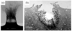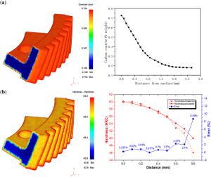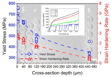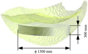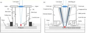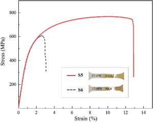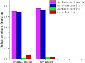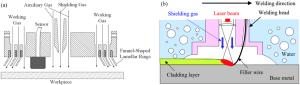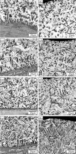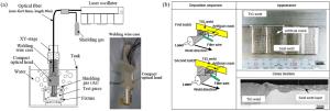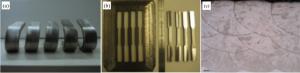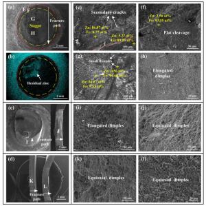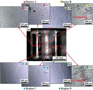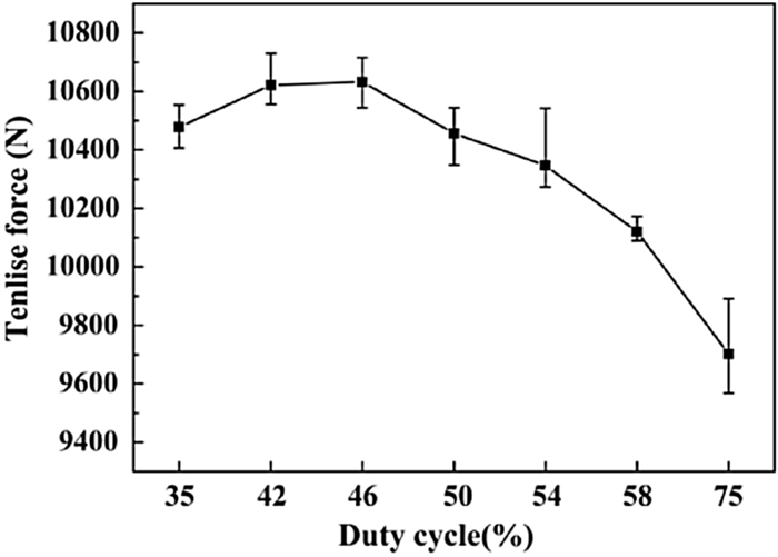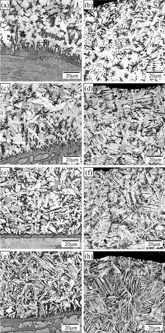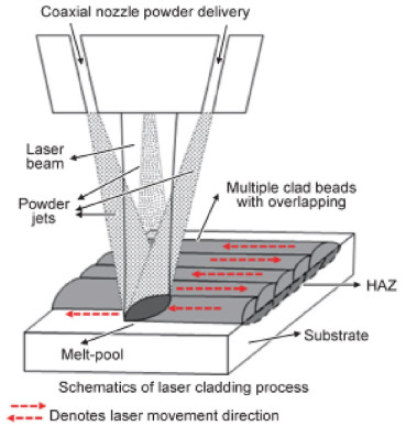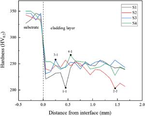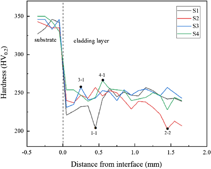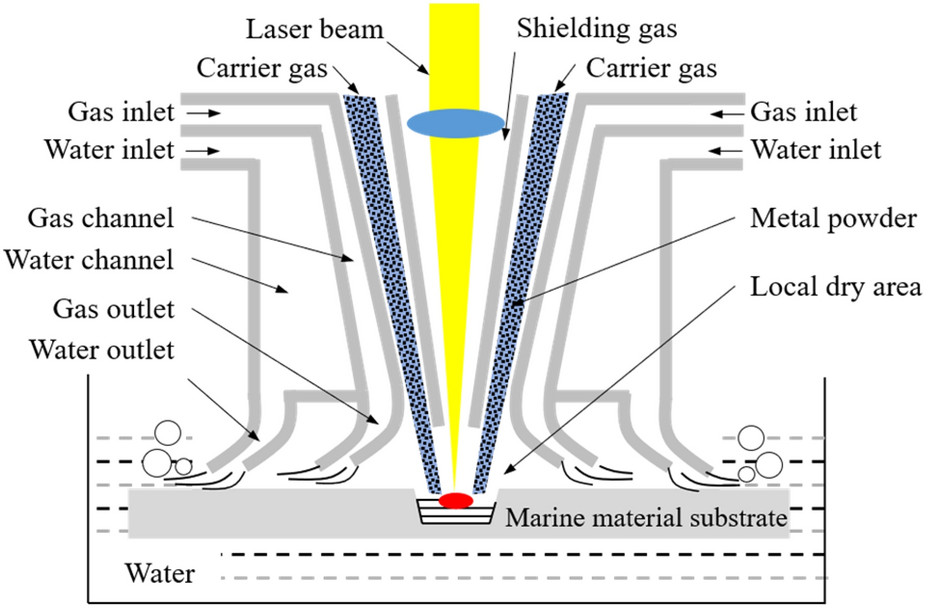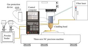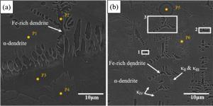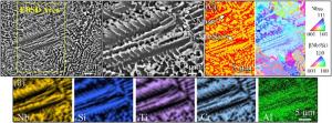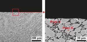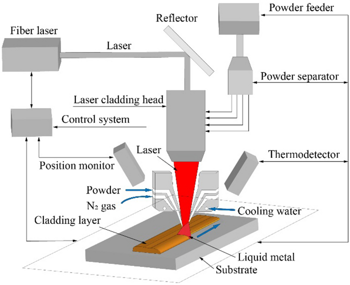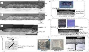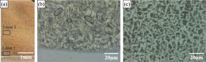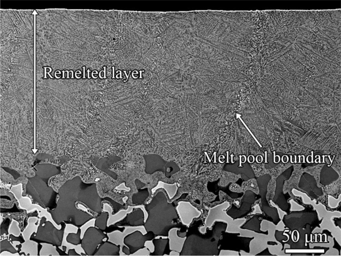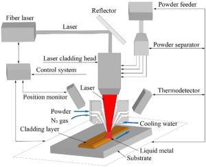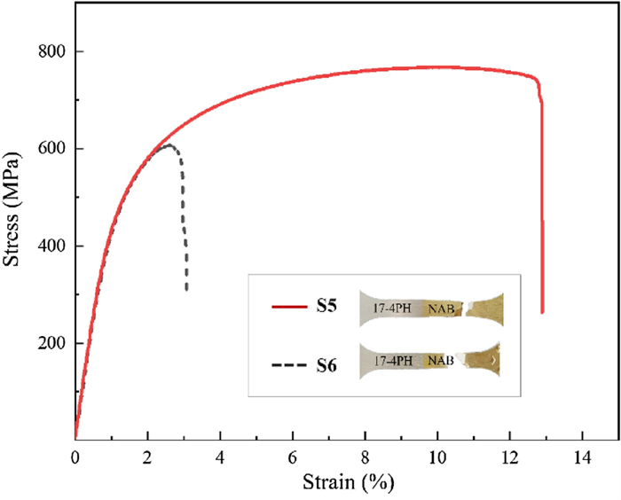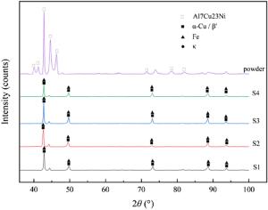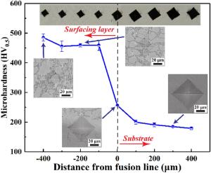 Bimetallic copper-steel composite could be an effective structural material to improve the performance of traditional nickel-aluminum bronze (NAB) ship propeller due to its high structural strength and corrosion resistance. In this work, the defect-free NAB coatings has been successfully fabricated by laser direct depositing technique on the 17-4PH stainless steel substrate. The phase constitution, microstructure characteristics and hardness properties were investigated in details. The XRD results showed that the coatings mainly consisted of α-Cu, Fe and intermetallic κ phases despite the diffraction peaks shifted more than 0.5°, which may due to the influence of the Ni, Fe and Al atoms dissolved into Cu-matrix. The microstructures of the coatings were affected significantly by laser energy density according to SEM and EDS results. The top region of the coating was more undercooled during solidification, therefore the grains at this region was much finer than that at the bottom region. The higher energy input would lead to coarser grains. Fe-rich dendrites and spherical particles were found in the Cu matrix, which could be a result of liquid separation. The hardness of the coating is in the range of 204 HV0.2–266 HV0.2 which is higher than traditional as- cast NAB. The uneven distribution of Fe-rich phases as well as the hard κ phases could be the main reasons for the fluctuations of the hardness value. Tensile fracture occurred at bronze side, not at transition zone, which shows there is a good interfacial bonding between the two metals produced by laser cladding.
