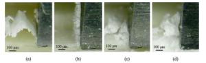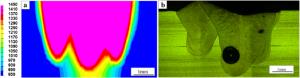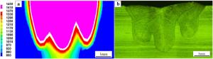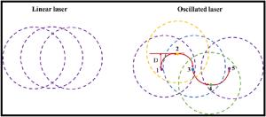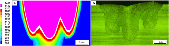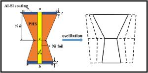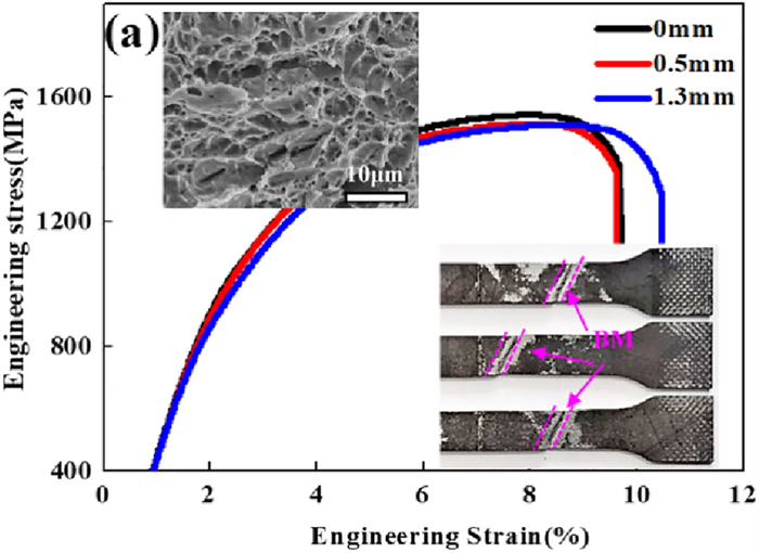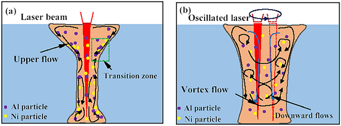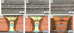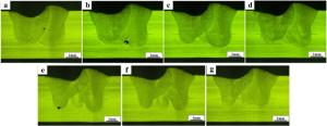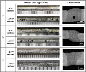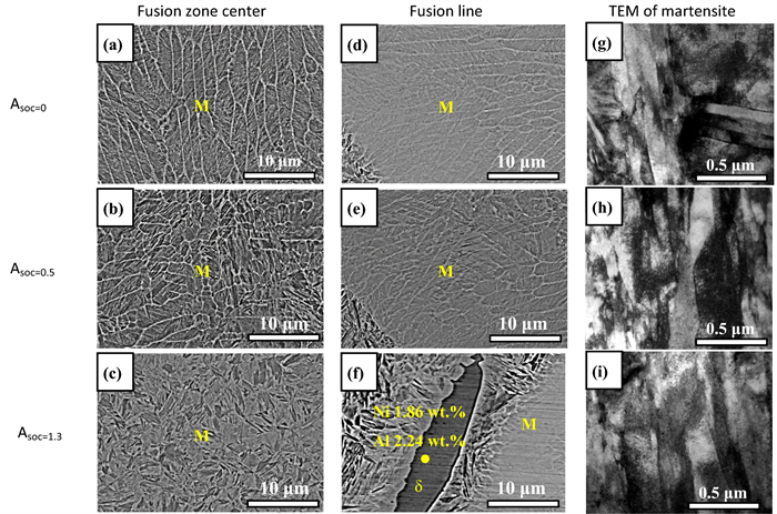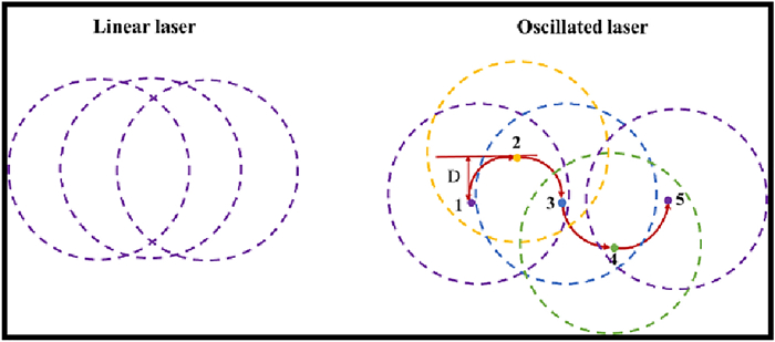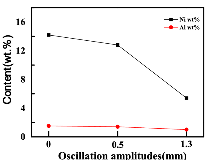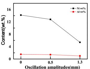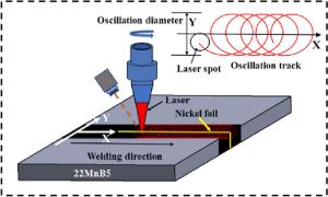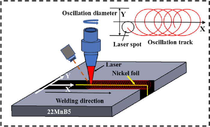 Laser oscillating welding was employed to fabricate Al-Si coated press-hardened steel (PHS) to improve the element homogeneity in the fusion zone. Laser oscillating welding was employed with various oscillation amplitudes (0 mm, 0.5 mm and 1.3 mm) in this present. Ni foil of 0.06 mm thickness was used as an interlayer between two tailored PHS welded. The weld morphology, elemental profile, microstructure and tensile strength of welded joints were studied. The results showed that full penetration weld without any weld defects were achieved for any oscillation amplitudes, and weld width increased with increasing oscillation amplitudes. With the oscillation amplitudes increased, Ni and Al had an uneven elemental profile due to strong stirring force, but the Ni and Al content in the weld was decreased and Ni had a sharp descent compared to Al element. Only few δ-ferrite was presented in fusion line with the oscillation amplitudes increased to 1.3 mm. The oscillation amplitudes did not have an effect on the tensile properties, which was similar to that of base metal. But if keeping increasing the oscillation amplitudes or reducing the thickness of Ni interlayer, it has a potential risk to form more and more δ ferrite such that deteriorate the mechnical properties of welded joints.