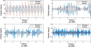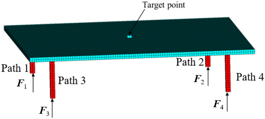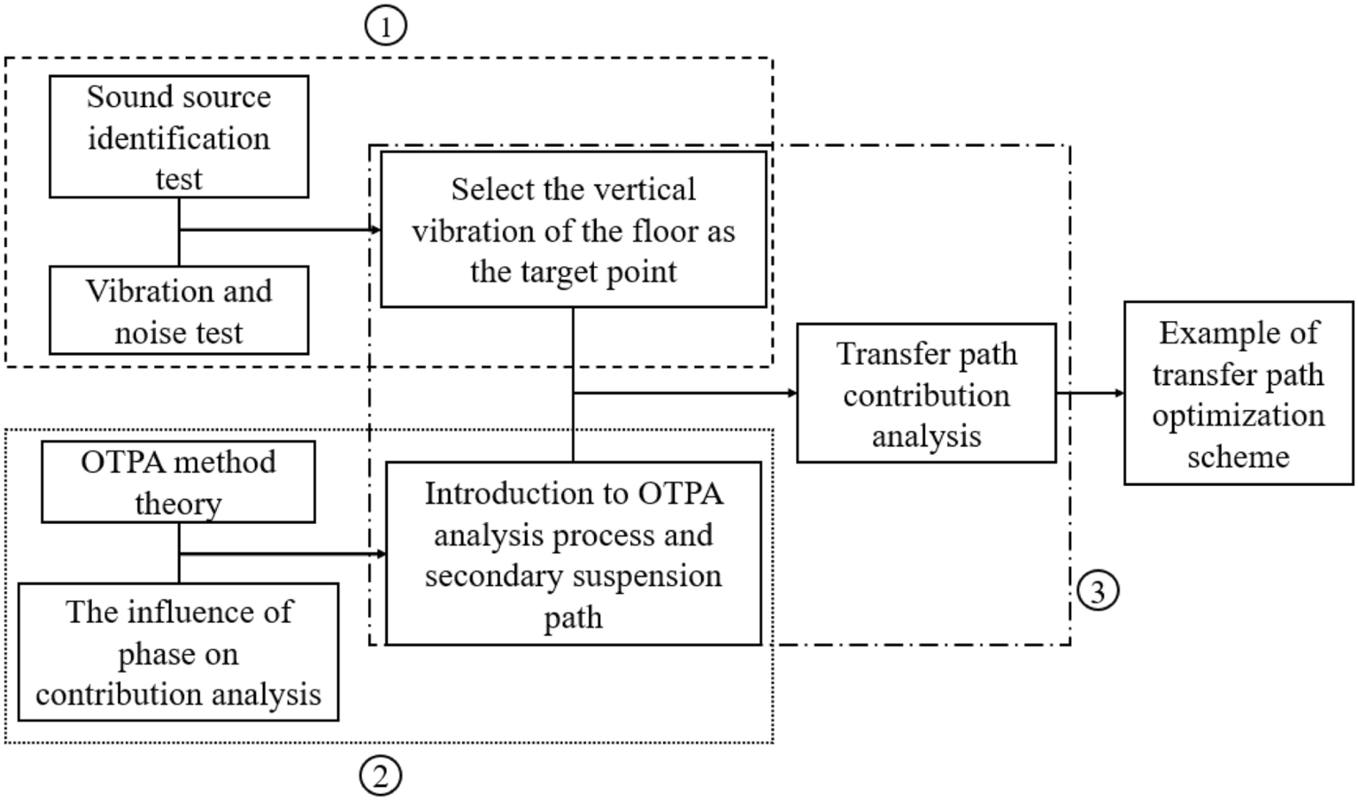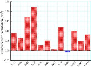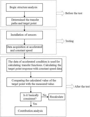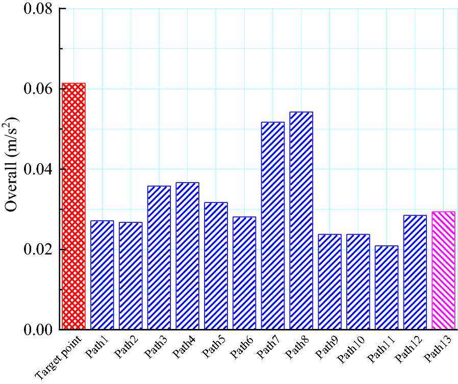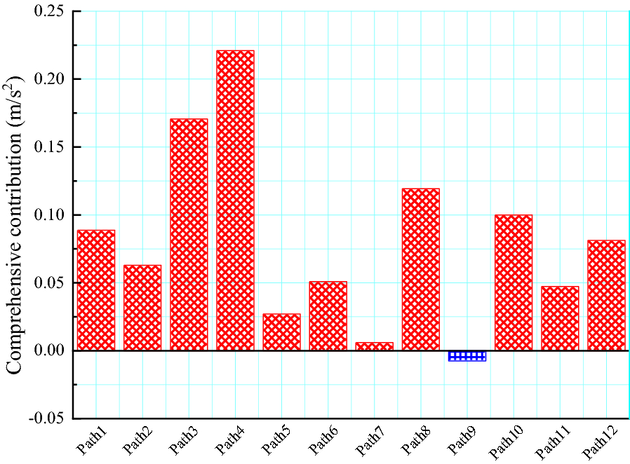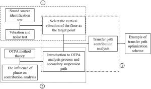 Operational transfer path analysis (OTPA) is an advanced vibration and noise transfer path identification and contribution evaluation method. However, the application of OTPA to rail transit vehicles considers only the excitation amplitude and ignores the influence of the excitation phase. This study considers the influence of the excitation amplitude and phase, and analyzes the contribution of the secondary suspension path to the floor vibration when the metro vehicle runs at 60 km/h, using an analysis based on the OTPA method. The results show that the vertical direction of the anti-rolling torsion bar area provides the maximum contribution to the floor vibration, with a contribution of 22.1%, followed by the longitudinal vibration of the air spring area, with a contribution of 17.1%. Based on the contribution analysis, a transfer path optimization scheme is proposed, which may provide a reference for the optimization of the transfer path of metro vehicles in the future.