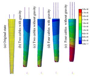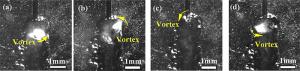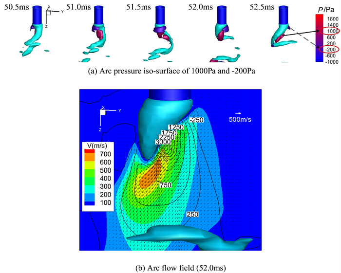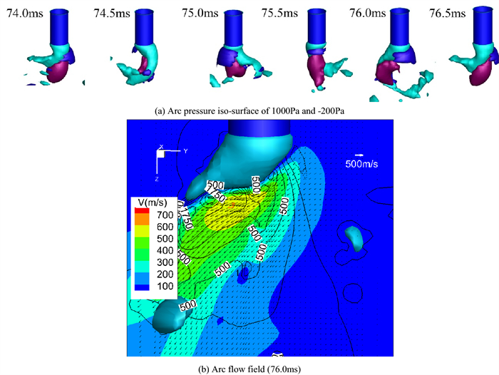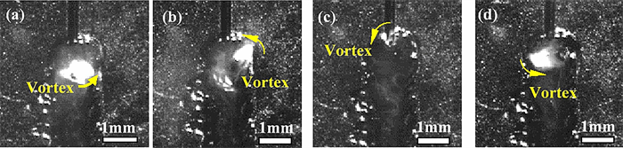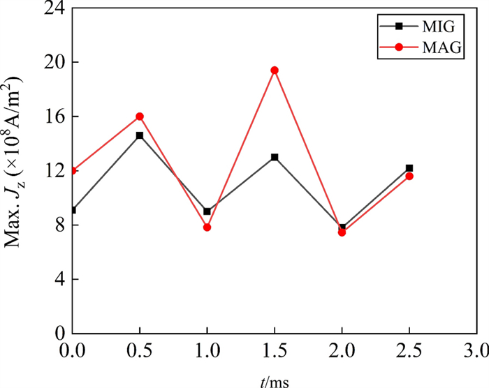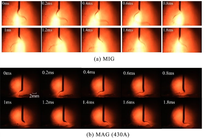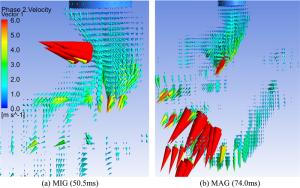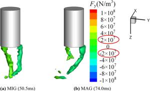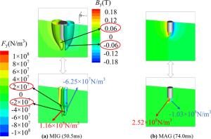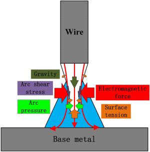 A three-dimensional numerical model based on the volume-of-fluid (VOF) method is typically preferred for studying high-current gas metal arc welding (GMAW) metal transfer mechanism and then controlling it. It is informed that the rotating spray transfer is extremely complicated, and some researchers have focused on simplified models without considering the energy conservation to make analysis manageable for the unstable metal transfer process. Using our created numerical model, the metal transfer of high-current GMAW with shielding gas of different conductivities has been studied by analyzing acting forces and fluid flows in the metal liquid column, especially for the contributions of the self-induced electromagnetic force, equivalent volume force of the capillary pressure of the surface tension (Named surface tension force in this work), static arc pressure. It is found that the unbalanced electromagnetic force greatly promotes the metal rotating motion in 500 A metal inert gas (MIG) welding with pure argon shielding gas and it pushes the metal liquid column to rotate. Considering the arc constricting effect in active shielding gas by simply changing the arc conductivity, it is found that the metal liquid column no longer rotates, it turns to swing since the unbalanced electromagnetic force is large enough to break the rotating motion. The calculated results of the metal liquid column deflected angle and rotating/swing frequency agree well with the experiment of high-speed camera observations.