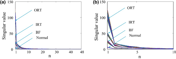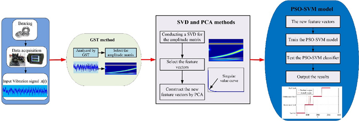 Feature information extraction is one of the key steps in prognostics and health management of rotating machinery. In the present study, an investigation about the feasibility of a methodology based on generalized S transform (GST) and singular value decomposition (SVD) methods for feature extraction in rolling bearing, due to local damage under variable conditions, is conducted. The technique adopts the GST method, following the time-frequency analysis, to transform a raw fault signal of the rolling bearing into a two-dimensional complex matrix. And then, the SVD method is performed to decompose the matrix to obtain the feature vectors. By this procedure it is possible to obtain the fault feature information of rolling bearing under different speeds and different loads. In order to streamline the feature parameters of the feature vectors to train more uncomplicated models, the principal component analysis (PCA) subsequently performed. The particle swarm optimization-support vector machine (PSO-SVM) model is used to identify and classify the different fault states of rolling bearing. Furthermore, in order to highlight the superiority of the proposed method some comparisons are conducted with the conventional methods. The obtained results show that the proposed method can effectively extract fault features of the rolling bearing under variable conditions.