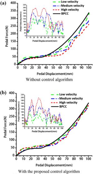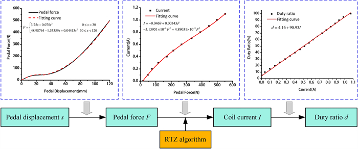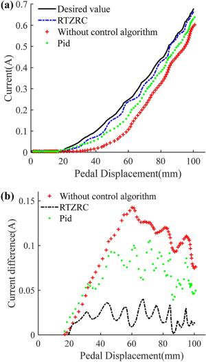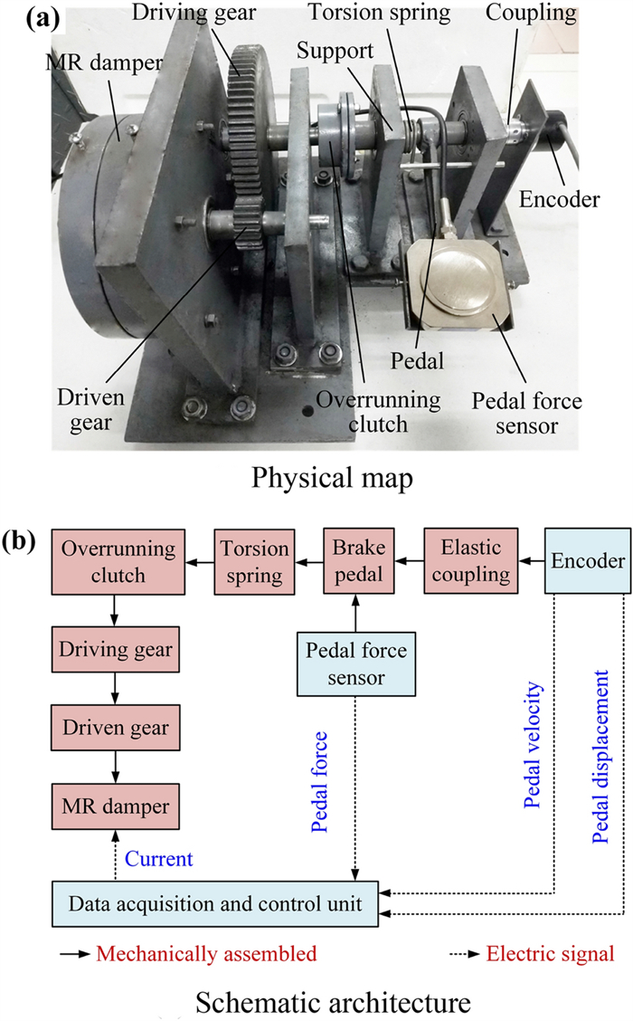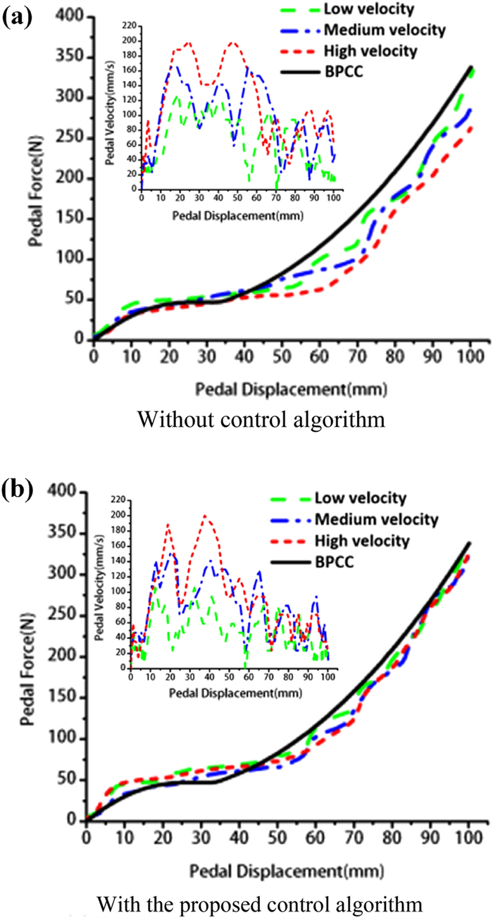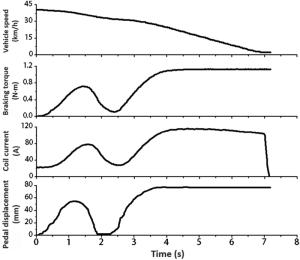 Recent developments have demonstrated that the brake pedal simulator (BPS) is becoming an indispensable apparatus for the break-by-wire systems in future electric vehicles. Its main function is to provide the driver with a comfortable pedal feel to improve braking safety and comfort. This paper presents the development and control of an adjustable BPS, using a disk-type magnetorheological (MR) damper as the passive braking reaction generator to simulate the traditional pedal feel. A detailed description of the mechanical design of the MR damper-based BSP (MRDBBPS) is presented in this paper. Several basic performance experiments on the MRDBBPS prototype are conducted. A return-to-zero (RTZ) algorithm is proposed to avoid hysteresis and improve the repeatability of the pedal force. In addition, an RTZ algorithm-based real-time current-tracking controller (RTZRC) is designed in consideration of the response lag of the coil circuit. Finally, an experimental system is established by integrating the MRDBBPS prototype into a self-developed automotive MR braking test bench (AMRBTB), and several control and braking experiments are performed. This research proposes a RTZRC control algorithm which can significantly increase the tracking accuracy of the brake pedal characteristic curve, particularly at a high pedal velocity. Additionally, the designed MRDBBPS prototype can achieve an effective and favorable control of the AMRBTB with a good repeatability.