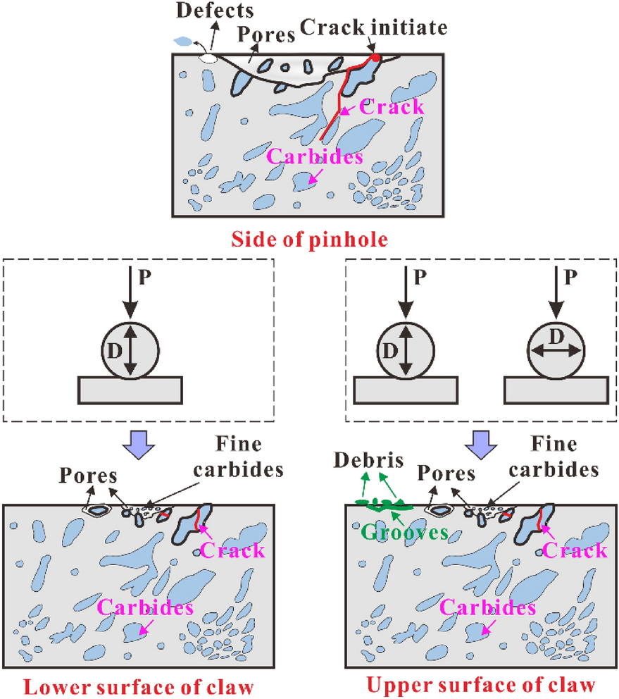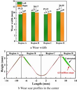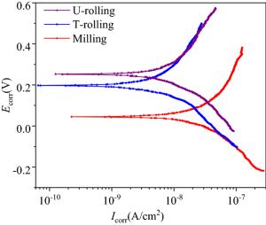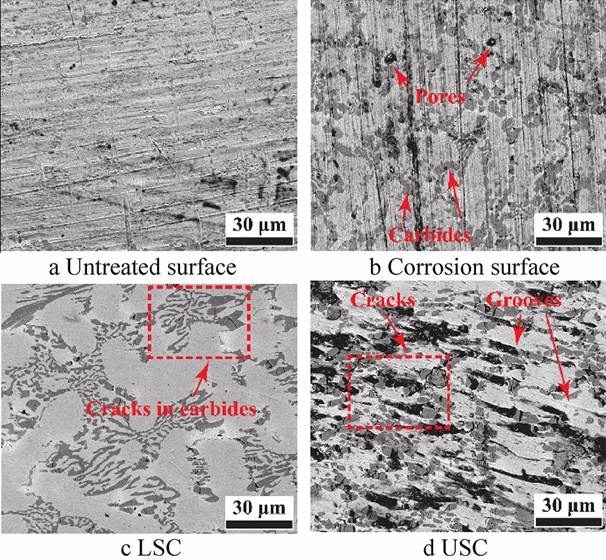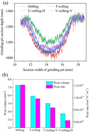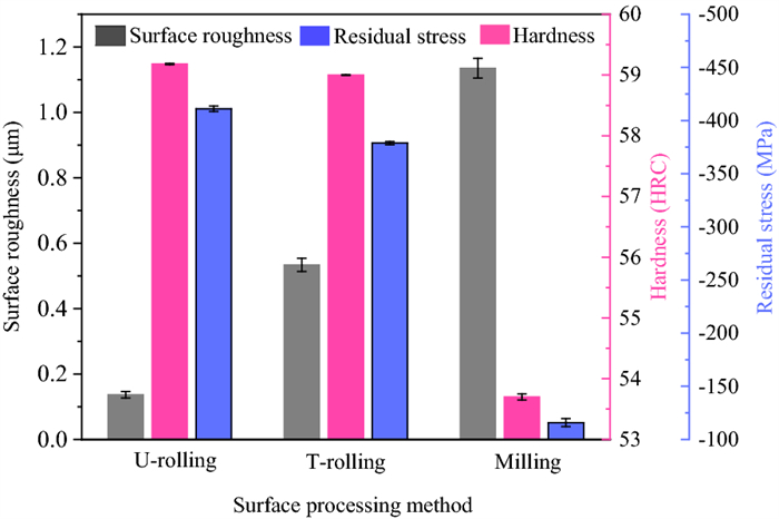 Laser cladding is a new surface repair method that can improve the wear and corrosion resistance of substrate surfaces. However, the cladding layer typically exhibits a rough surface, high hardness and large residual tensile stress, and thus requires further machining and finishing. Ultrasonic rolling (U-rolling) is a highly efficient finishing and strengthening process that combines ultrasonic technology with traditional rolling (T-rolling). In this study, an iron-based alloy was coated onto the surface of H13 die steel using laser cladding, and the surface of the cladding layer was polished using U-rolling. The effects of U-rolling on the surface quality, corrosion resistance and friction and wear properties of the laser-cladding layer were investigated and compared with those obtained by T-rolling. The surface roughness of the U-rolled sample was only 1/4 that of the T-rolled sample. The hardness and residual compressive stress of the laser cladding layer after U-rolling were higher than those after T-rolling. Similarly, the surface corrosion resistance of the laser cladding layer after U-rolling was higher than that after T-rolling. U-rolling changed the surface roughness, grain size, and residual stress of the material and thus affected the corrosion resistance of the laser cladding layer. The friction coefficient and wear rate of the U-rolled surface of the cladding layer were lower than those of the T-rolled surface. In addition, the tribological properties of the cladding layer were found to be related to the rolling direction. When the friction direction of the sample was the same as the rolling direction, its friction and wear performance were higher than those when the two directions were perpendicular.