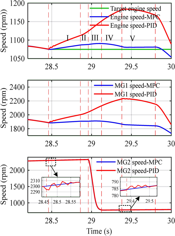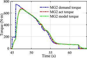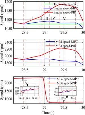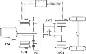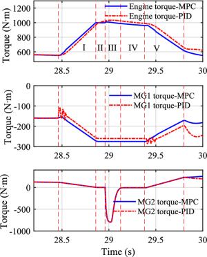 Two-speed clutchless automated manual transmission (AMT) has been widely implemented in electric vehicles for its simple structure and low cost. In contrast, due to the complex response characteristics of powertrain, utilizing clutchless AMT in a hybrid power system comes with complex coordination control problems. In order to address these issues, a power-split hybrid electric bus with two-speed clutchless AMT is studied in this paper, and a coordinated control method based on model predictive control (MPC) is used in gear shifting control strategy (GSCS) to improve gear shifting quality and reduce system jerk. First, the dynamic model of power sources and other main powertrain components including a single planetary gear set and AMT are established on the basis of data-driven and mechanism modeling methods. Second, the GSCS is put forward using the segmented control idea, and the shifting process is divided into five phases, including (Ⅰ) unloading of drive motor, (Ⅱ) shifting to neutral gear, (Ⅲ) active speed synchronization by drive motor, (Ⅳ) engaging to new gear, and (Ⅴ) resuming the drive motor's power, among which the phases Ⅰ and Ⅴ have evident impact on the system jerk. Then, the MPC-based control method is adopted for these phases, and the fast compensation of driving torque is realized by combining the prediction model and quadratic programming method. The simulation results show that the proposed GSCS can effectively reduce shift jerk and improve driving comfort. This research proposes a coordinated control strategy of two-speed clutchless AMT, which can effectively improve the smoothness of gear shifting and provides a reference for the application of two speed clutchless AMT in power-split hybrid powertrains.