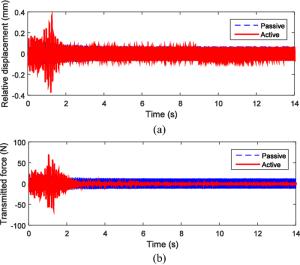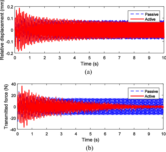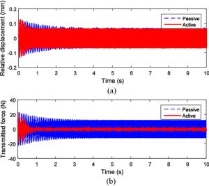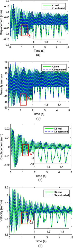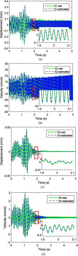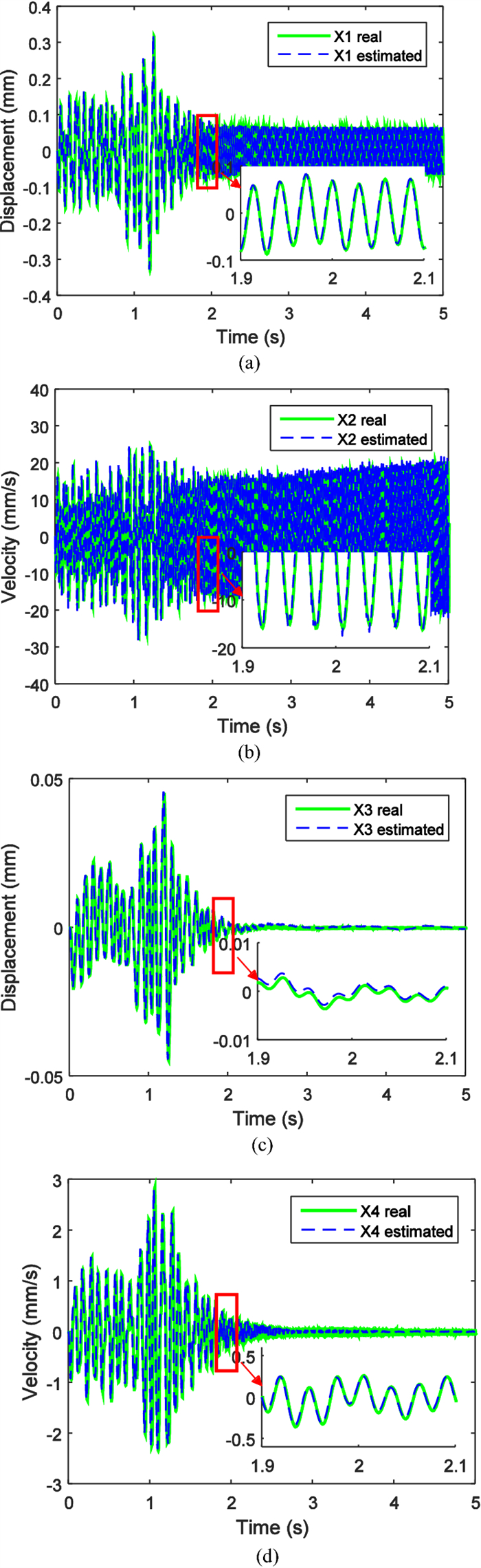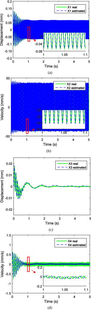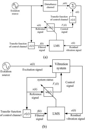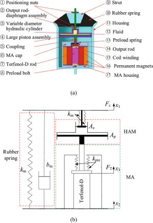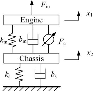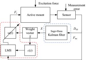 Engine mount system affects the automobile NVH performance. Active mounts would achieve excellent vibration isolation and relative displacement control performance in a broad frequency bandwidth by outputting controlled force to the mounting system. The actuator and control method of the active mounts determine the system performance. In this paper, an active mount based on the smart material, i.e., Terfenol-D rod, is proposed, which mainly includes three parts: rubber spring, magnetostrictive actuator (MA), and hydraulic amplification mechanism (HAM). Dynamic model of the active mount is correspondingly established. A state feedback control method based on x-LMS (Least-Mean-Square) algorithm is proposed as well. Specifically, with the consideration of the unmeasurable state parameters in the active mounting system, an x-LMS state feedback controller with the system state as the reference signal is constructed by employing Sage-Husa Kalman filter to realize the state estimation of the active mounting system. Then a detailed analysis of the proposed control method is conducted, with deriving iterative formula of tap-weight vector. Sequentially, the problem of the dependence on the excitation signal in the x-LMS algorithm is addressed. The feasibility and capability of the proposed control method are verified and evaluated by simulation of a two-degree-of-freedom active mounting system.