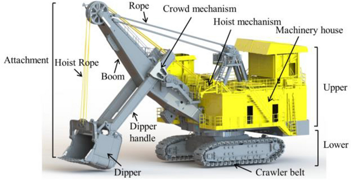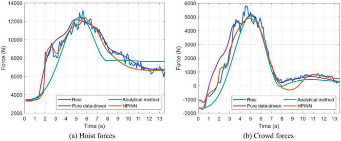 Electric cable shovel (ECS) is a complex production equipment, which is widely utilized in open-pit mines. Rational valuations of load is the foundation for the development of intelligent or unmanned ECS, since it directly influences the planning of digging trajectories and energy consumption. Load prediction of ECS mainly consists of two types of methods: physics-based modeling and data-driven methods. The former approach is based on known physical laws, usually, it is necessarily approximations of reality due to incomplete knowledge of certain processes, which introduces bias. The latter captures features/patterns from data in an end-to-end manner without dwelling on domain expertise but requires a large amount of accurately labeled data to achieve generalization, which introduces variance. In addition, some parts of load are non-observable and latent, which cannot be measured from actual system sensing, so they can't be predicted by data-driven methods. Herein, an innovative hybrid physics-informed deep neural network (HPINN) architecture, which combines physics-based models and data-driven methods to predict dynamic load of ECS, is presented. In the proposed framework, some parts of the theoretical model are incorporated, while capturing the difficult-to-model part by training a highly expressive approximator with data. Prior physics knowledge, such as Lagrangian mechanics and the conservation of energy, is considered extra constraints, and embedded in the overall loss function to enforce model training in a feasible solution space. The satisfactory performance of the proposed framework is verified through both synthetic and actual measurement dataset.