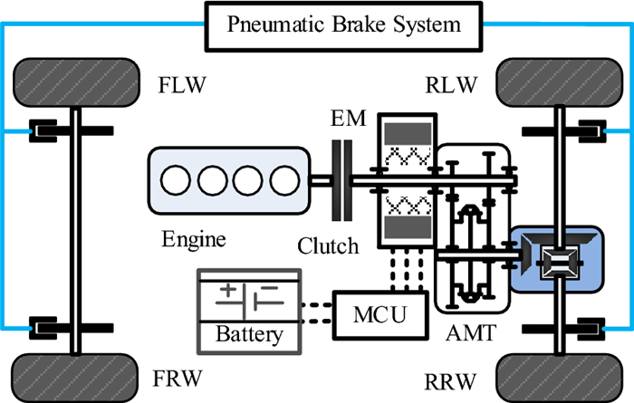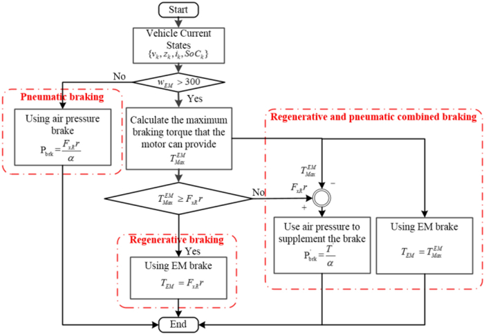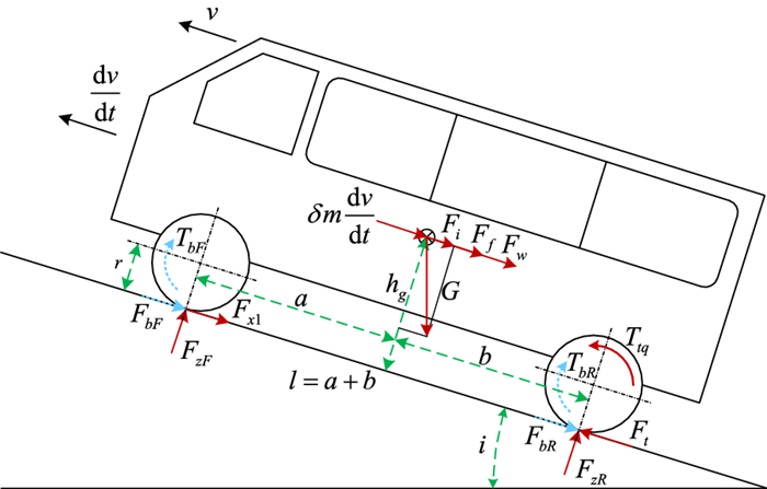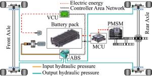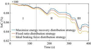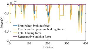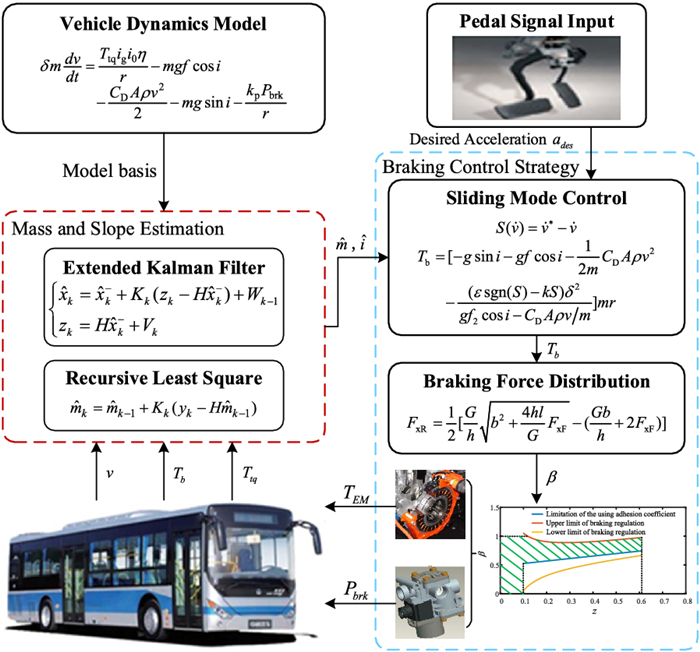 Proper braking force distribution strategies can improve both stability and economy performance of hybrid electric vehicles, which is prominently proved by many studies. To achieve better dynamic stable performance and higher energy recovery efficiency, an effective braking control strategy for hybrid electric buses (HEB) based on vehicle mass and road slope estimation is proposed in this paper. Firstly, the road slope and the vehicle mass are estimated by a hybrid algorithm of extended Kalman filter (EKF) and recursive least square (RLS). Secondly, the total braking torque of HEB is calculated by the sliding mode controller (SMC), which uses the information of brake intensity, whole vehicle mass, and road slope. Finally, comprehensively considering driver's braking intention and regulations of the Economic Commission for Europe (ECE), the optimal proportional relationship between regenerative braking and pneumatic braking is obtained. Furthermore, related simulations and experiments are carried out on the hardware-in-the-loop test bench. Results show that the proposed strategy can effectively improve the braking performance and increase the recovered energy through precise control of the braking torque.