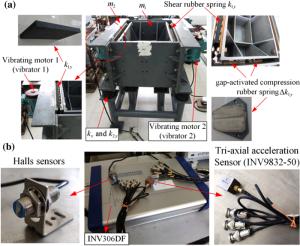 In previous studies about the synchronization of vibrators, the restoring forces of springs are mainly treated as linear directly, whereas the nonlinear features are rarely considered in vibrating systems. To make up this drawback, a dynamical model of a nonlinear vibrating mechanical system with double rigid frames (RFs), driven by two vibrators, is proposed to explore the synchronization and stability of the system. In this paper, the nonlinearity is reflected in nonlinear restoring forces of springs characterized by asymmetrical piecewise linear, where the nonlinear stiffness of springs is linearized equivalently using the asymptotic method. Based on the average method and Hamilton's principle, the theory conditions to achieve synchronization and stability of two vibrators are deduced. After the theory analyses, some numerical qualitative analyses are given to reveal the coupling dynamical characteristics of the system and the relative motion properties between two RFs. Besides, some experiments are carried out to examine the validity of the theoretical results and the correctness of the numerical analyses results. Based on the comparisons of the theory, numeric and experiment, the ideal working regions of the system are suggested. Based on the present work, some new types of vibrating equipment, such as vibrating discharging centrifugal dehydrators/conveyers/screens, can be designed.
