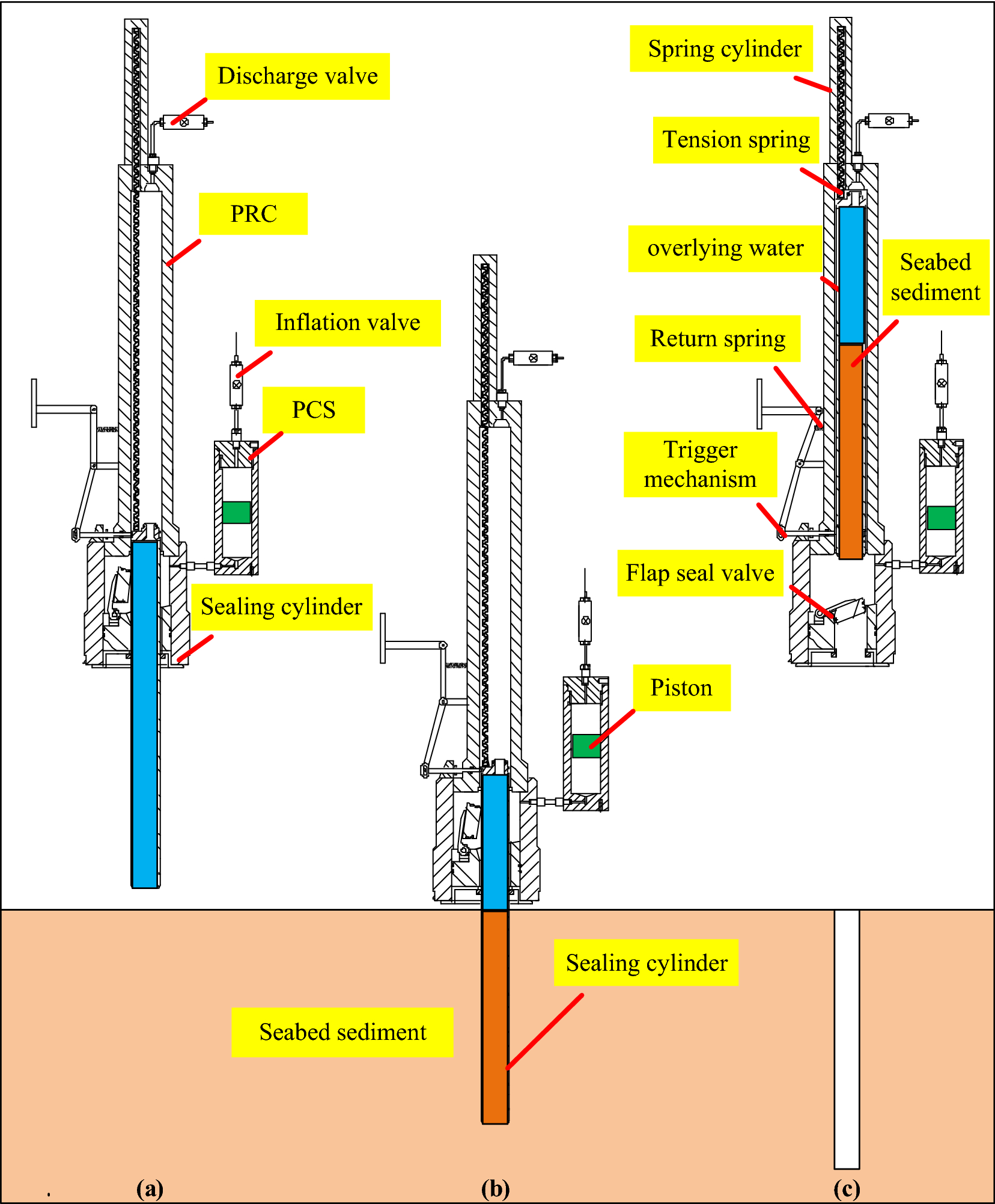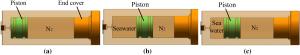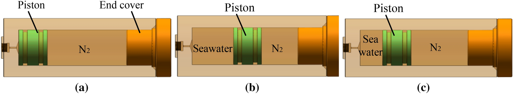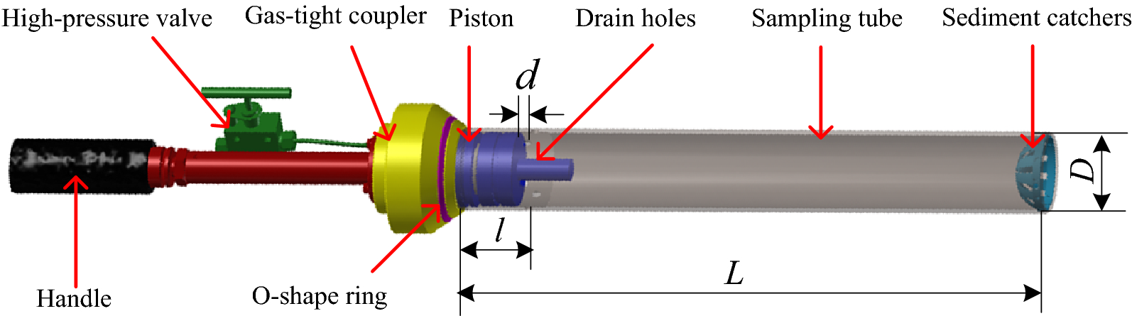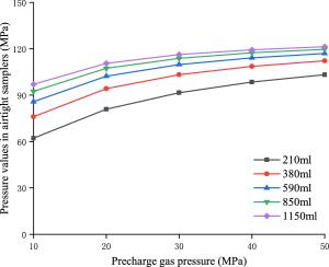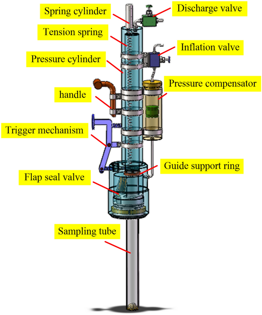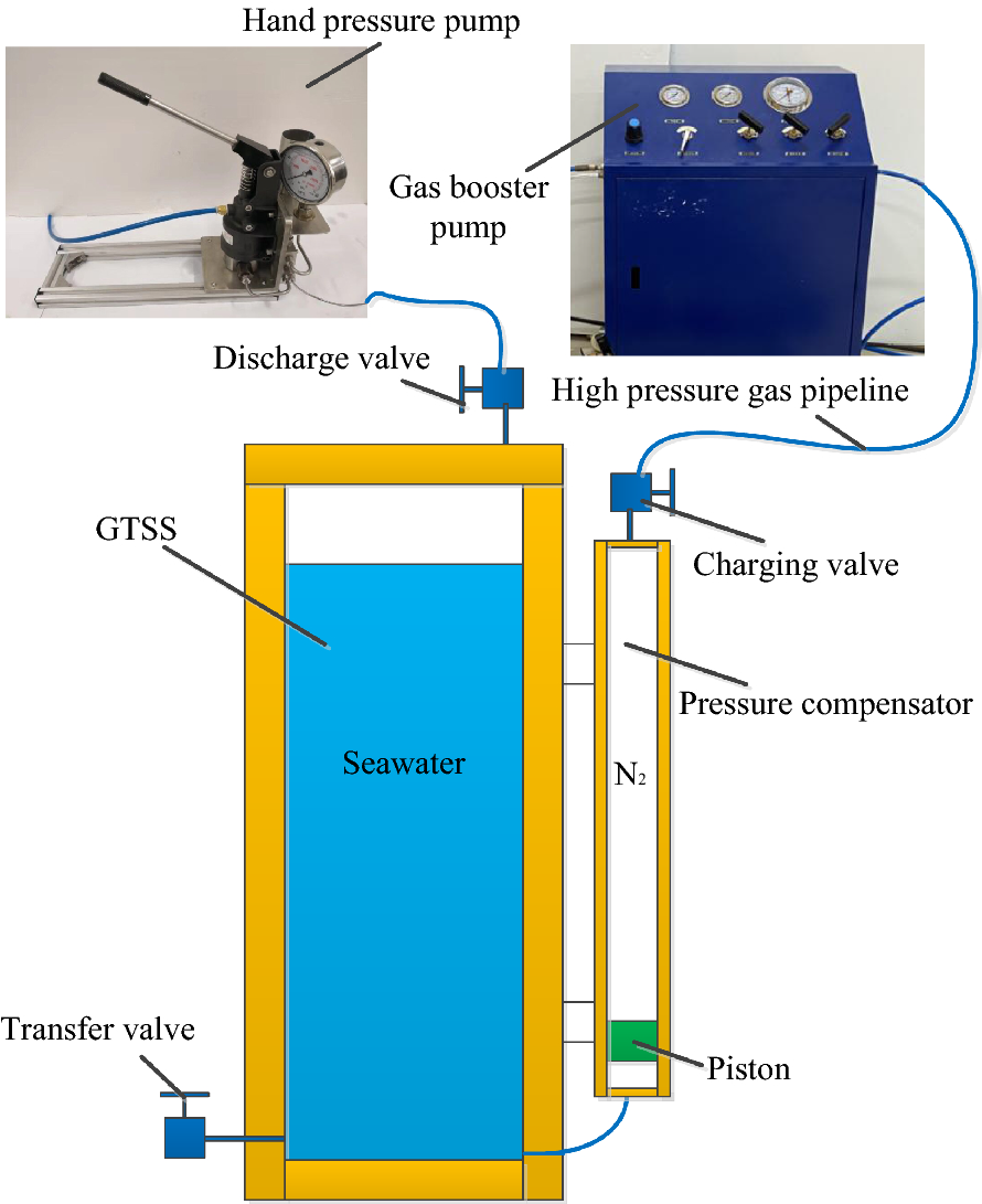 Aiming at the requirement of the full-ocean-depth (operating water depth 11000 m) manned submersible to carry out the gas-tight sampling operation of the abyss seabed sediment, a kind of full-ocean-depth carrier submersible mechanical hand-held, full-ocean-depth gas-tight sediment sampler (GTSS) with the function of pressure-retaining and coring is designed. Firstly, the volume change model of pressure compensator is established, and it is pointed out that the volume of pressure compensator is about 16.14% equal to the volume of gas-tight sediment sampler (GTSS). Secondly, the pressure compensator is analyzed and calculated, and the relationship between the precharge pressure of the pressure compensator, the nominal volume of the pressure compensator and the pressure holding effect of the gas-tight sediment sampler (GTSS) is studied. The results show that with the increase of gas precharge pressure in the pressure compensator, the final pressure of the sampler also increases. Under the same precharge pressure condition, the larger the nominal volume of the pressure compensator, the greater the final pressure of the sampler. Finally, the air tightness test method is designed by using the developed gas tightness sampler of the full-ocean-depth product, and the change of the final pressure in the gas tight sampler under different precharge pressure is observed. The test results are consistent with the simulation results, indicating the correctness of the pressure compensation system (PCS) model.
