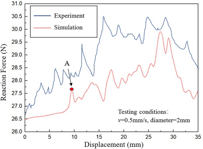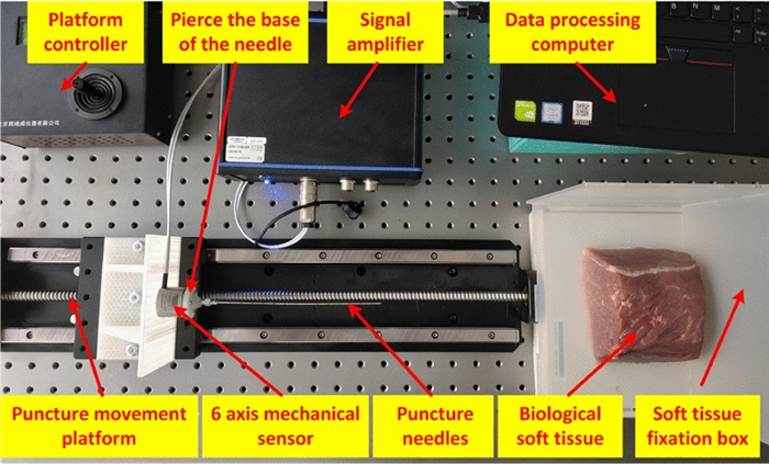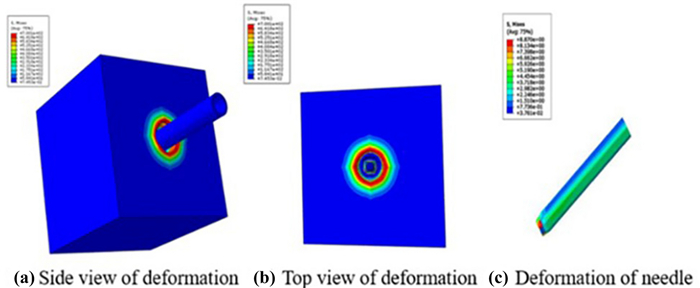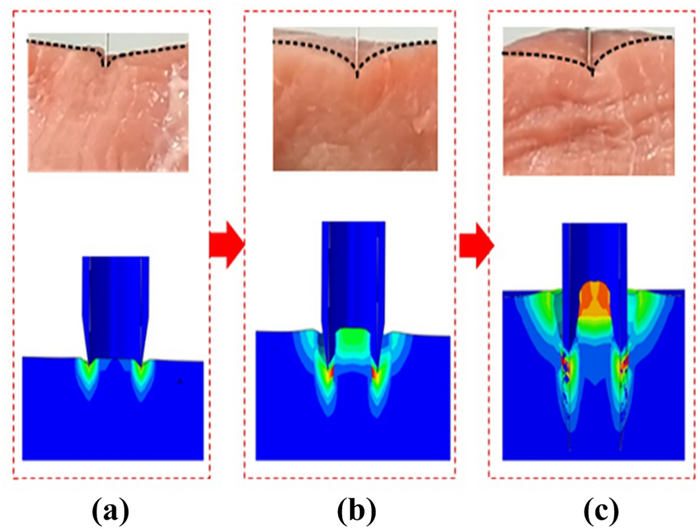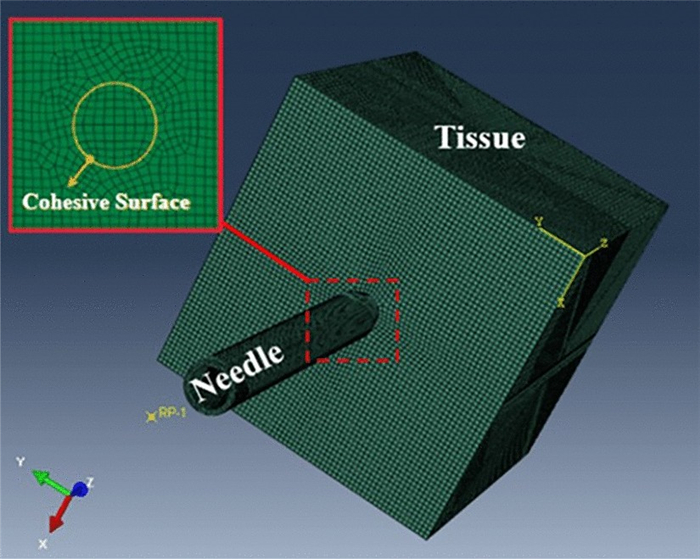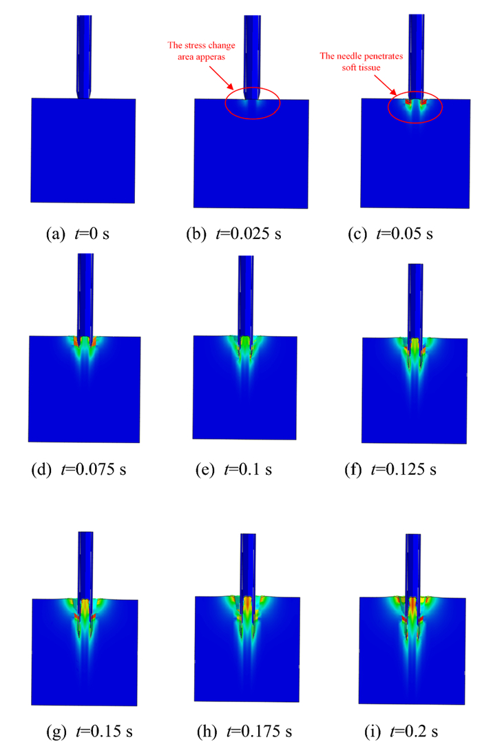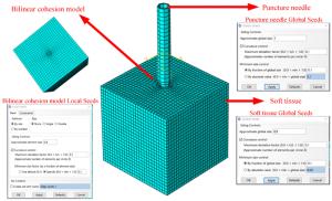 Minimally invasive surgery is an important technique used for cytopathological examination. Recently, multiple studies have been conducted on a three-dimensional (3D) puncture simulation model as it can reveal the internal deformation state of the tissue at the micro level. In this study, a viscoelastic constitutive equation suitable for muscle tissue was derived. Additionally, a method was developed to define the fracture characteristics of muscle tissue material during the simulation process. The fracture of the muscle tissue in contact with the puncture needle was simulated using the cohesive zone model and a 3D puncture finite element model was established to analyze the deformation of the muscle tissue. The stress nephogram and reaction force under different parameters were compared and analyzed to study the deformation of the biological soft tissue and guide the actual operation process and reduce pain.