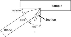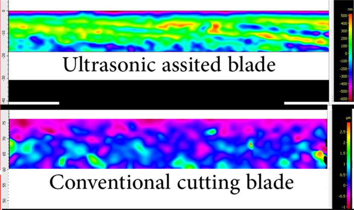 Modern-day microtomy requires high precision equipment to thinly section biological tissues. The sectioned tissue must be of good quality not showing cutting tracks or so-called artefacts. The quality of these sections is dependent on the blade wear, which is related to the hardness of the tissue sample, cutting angle and cutting speed. A test rig has been designed and manufactured to allow these parameters to be controlled. This has allowed for the blade wear to be analysed and quantified, and this has been completed for both ultrasonically assisted and conventional cutting. The obtained results showed a 25.2% decrease in average blade roughness after 38 cuts when using the ultrasonically assisted cutting regime. The data also showed no adverse effect on the quality of the slides produced when using this cutting methodology. Finally, the cutting force measured for both cutting regimes showed that ultrasonically assisted cutting required less force compared to conventional cutting. With the reduction of surface roughness and force, it is possible to state that ultrasonically assisted cutting reduces the wear of the blade, thereby increasing the life of the blades. An increase of just 10% in blade life would yield a cost saving of approximately 25% thereby reducing the environmental and financial impact of microtomy.