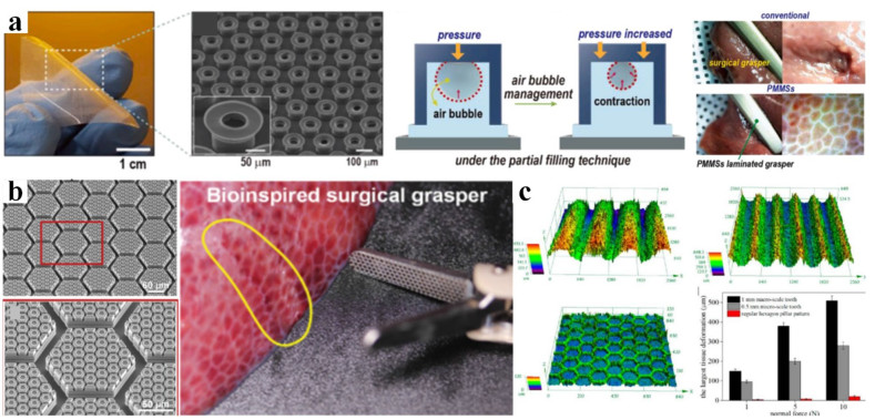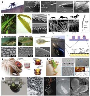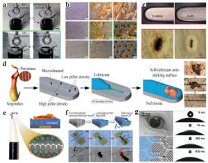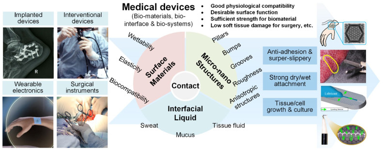 Medical devices are a major component of precision medicine and play a key role in medical treatment, particularly with the rapid development of minimally invasive surgery and wearable devices. Their tissue contact properties strongly affect device performance and patient health (e.g., heat coagulation and slipperiness on surgical graspers). However, the design and optimization of these device surfaces are still indistinct and have no supporting principles. Under such conditions, natural surfaces with various unique functions can provide solutions. This review summarizes the current progress in natural functional surfaces for medical devices, including ultra-slipperiness and strong wet attachment. The underlying mechanisms of these surfaces are attributed to their coupling effects and featured micro-nano structures. Depending on various medical requirements, adaptable designs and fabrication methods have been developed. Additionally, various medical device surfaces have been validated to achieve enhanced contact properties. Based on these studies, a more promising future for medical devices can be achieved for enhanced precision medicine and human health.