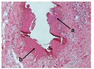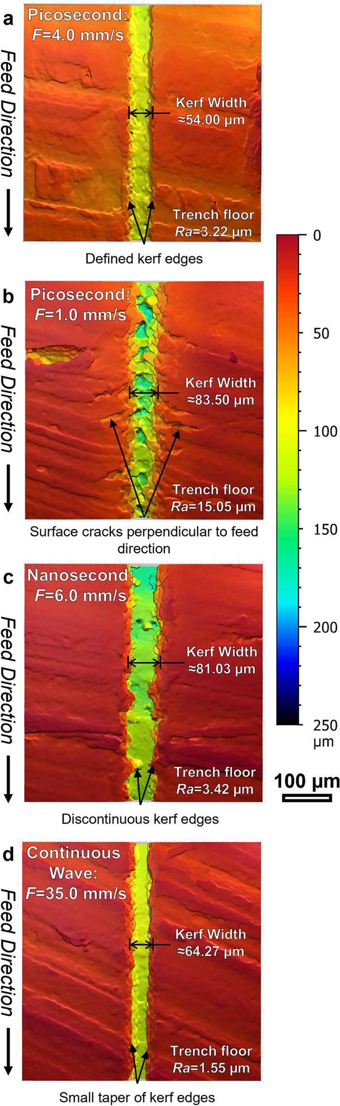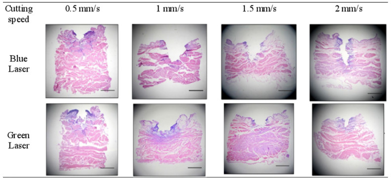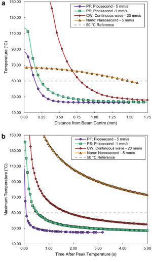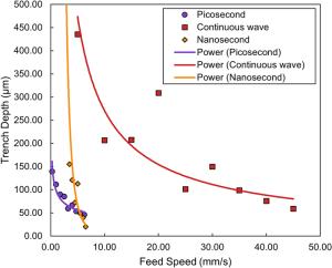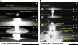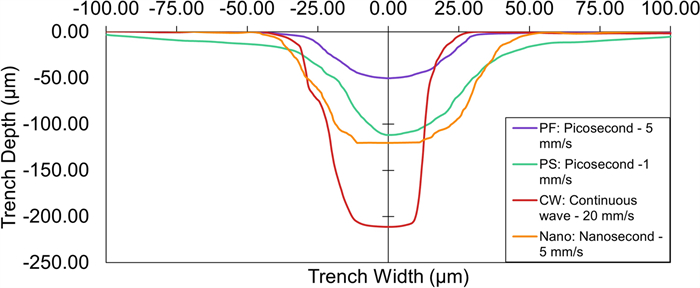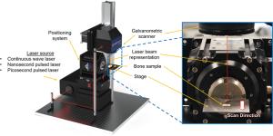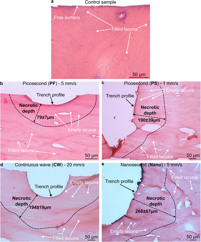 Bone cutting is of importance in orthopaedic surgery but is also challenging due to its nature of brittleness—where severe mechanical and thermal damages can be introduced easily in conventional machining. Laser machining is a new technology that can allow for complex cut geometries whilst minimising surface defects i.e., smearing, which occur in mechanical methods. However, comparative studies on the influence of lasers with different pulse characteristics on necrotic damage and surface integrity have not been reported yet. This paper for the first time investigates the effects of laser type on the necrotic damage and surface integrity in fresh bovine cortical bone after ex-situ laser machining. Three lasers of different pulse widths, i.e., picosecond, nanosecond and continuous wave lasers have been investigated with different feed speeds tested to study the machining efficiency. The cutting temperature, and geometrical outputs have been measured to investigate the thermal influence on the cooling behaviour of the bone samples while high-speed imaging was used to compare the material removal mechanisms between a pulsed and continuous wave laser. Furthermore, an in-depth histological analysis of the subsurface has revealed that the nanosecond laser caused the largest necrotic depth, owing to the high pulse frequency limiting the dissipation of heat. It has also been observed that surface cracks positioned perpendicular to the trench direction were produced after machining by the picosecond laser, indicative of the photomechanical effect induced by plasma explosions. Therefore, the choice of laser type (i.e., in terms of its pulse width and frequency) needs to be critically considered for appropriate application during laser osteotomy with minimum damage and improved healing.