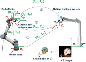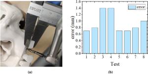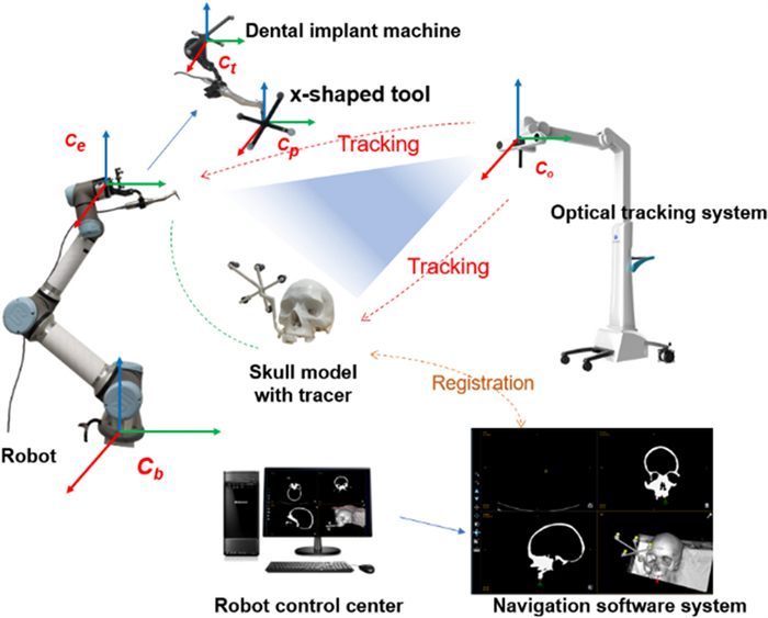 At present, dental implant surgery mainly relies on the clinical experience of the doctor and the assistance of preoperative medical imaging. However, there are some problems in dental implant surgery, such as narrow space, sight obstruction, inaccurate positioning, and high requirements of doctors' proficiency. Therefore, a dental implant robot system (DIRS) guided by optical navigation is developed in this study, with an x-shaped tool and an irregular pentagonal tracer are designed for spatial registration and needle tip positioning strategy respectively. The coordinate system of each unit in DIRS is unified through system calibration, spatial registration, and needle tip positioning strategy. Then the surgical path is planned on the computed tomography (CT) images in the navigation software before operation. The automatic positioning method and the auxiliary positioning method can be used in the operation to achieve accurate positioning and assist doctors to complete the operation. The errors of spatial registration, needle tip positioning strategy, and the overall accuracy of the system were evaluated respectively, and the results showed that they all met the needs of clinical surgery. This study preliminarily verified the feasibility of the precise positioning method for dental surgery robots and provided certain ideas for subsequent related research.