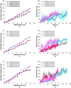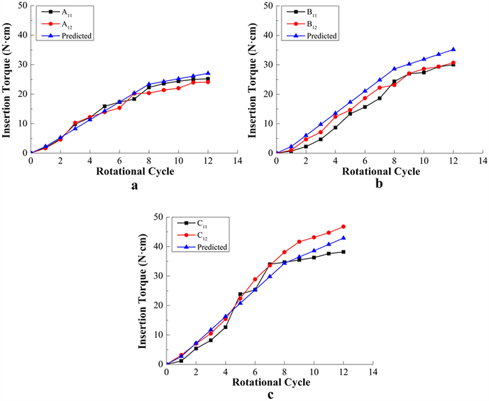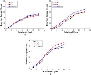 The insertion torque of a dental implant is an important indicator for the primary stability of dental implants. Thus, the preoperative prediction for the insertion torque is crucial to improve the success rate of implantation surgery. In this present research, an alternative method for prediction of implant torque was proposed. First, the mechanical model for the insertion torque was established based on an oblique cutting process. In the proposed mechanical model, three factors, including bone quality, implant geometry and surgical methods were considered in terms of bone-quality coefficients, chip load and insertion speeds, respectively. Then, the defined bone-quality coefficients for cancellous bone with the computed tomography (CT) value of 235–245, 345–355 and 415–425 Hu were obtained by a series of insertion experiments of IS and ITI implants. Finally, the insertion experiments of DIO implants were carried out to verify the accuracy of developed model. The predicted insertion torques calculated by the mechanical model were compared with those acquired by insertion experiments, with good agreement, the relative error being less than 15%. This method allows the insertion torque for different implant types to be quickly established and enhances prediction accuracy by considering the effects of implants' geometries and surgical methods.