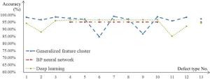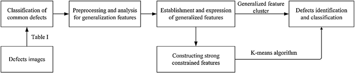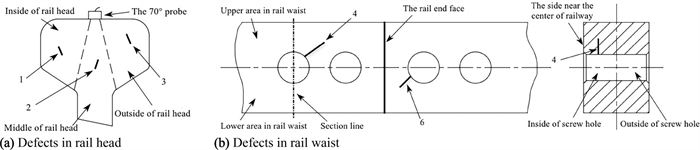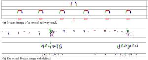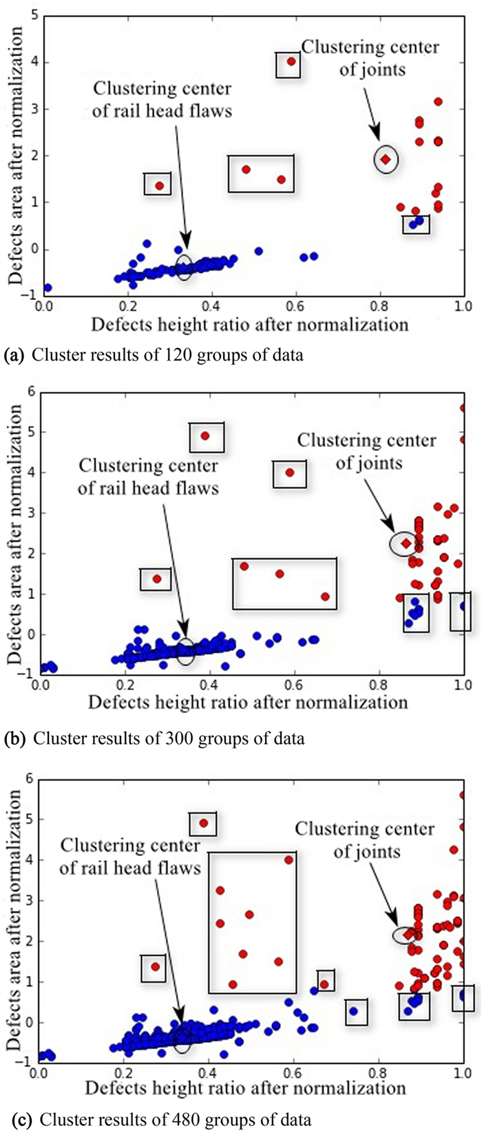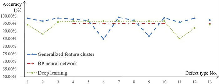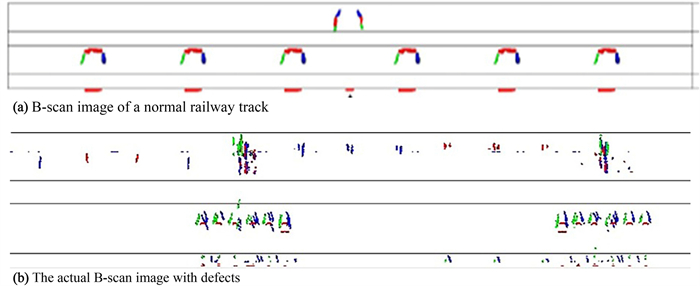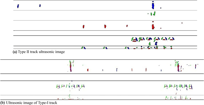 There may be several internal defects in railway track work that have different shapes and distribution rules, and these defects affect the safety of high-speed trains. Establishing reliable detection models and methods for these internal defects remains a challenging task. To address this challenge, in this study, an intelligent detection method based on a generalization feature cluster is proposed for internal defects of railway tracks. First, the defects are classified and counted according to their shape and location features. Then, generalized features of the internal defects are extracted and formulated based on the maximum difference between different types of defects and the maximum tolerance among same defects' types. Finally, the extracted generalized features are expressed by function constraints, and formulated as generalization feature clusters to classify and identify internal defects in the railway track. Furthermore, to improve the detection reliability and speed, a reduced-dimension method of the generalization feature clusters is presented in this paper. Based on this reduced-dimension feature and strongly constrained generalized features, the K-means clustering algorithm is developed for defect clustering, and good clustering results are achieved. Regarding the defects in the rail head region, the clustering accuracy is over 95%, and the Davies-Bouldin index (DBI) index is negligible, which indicates the validation of the proposed generalization features with strong constraints. Experimental results prove that the accuracy of the proposed method based on generalization feature clusters is up to 97.55%, and the average detection time is 0.12 s/frame, which indicates that it performs well in adaptability, high accuracy, and detection speed under complex working environments. The proposed algorithm can effectively detect internal defects in railway tracks using an established generalization feature cluster model.