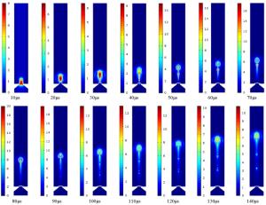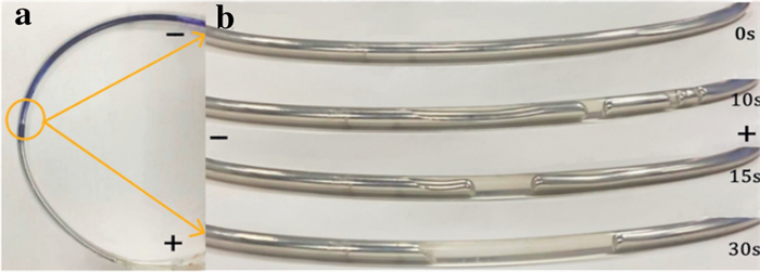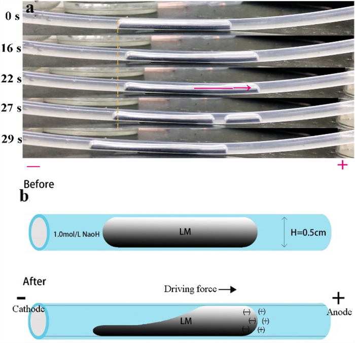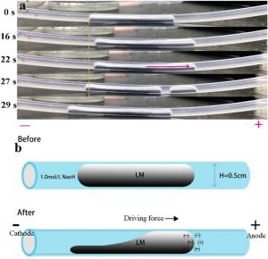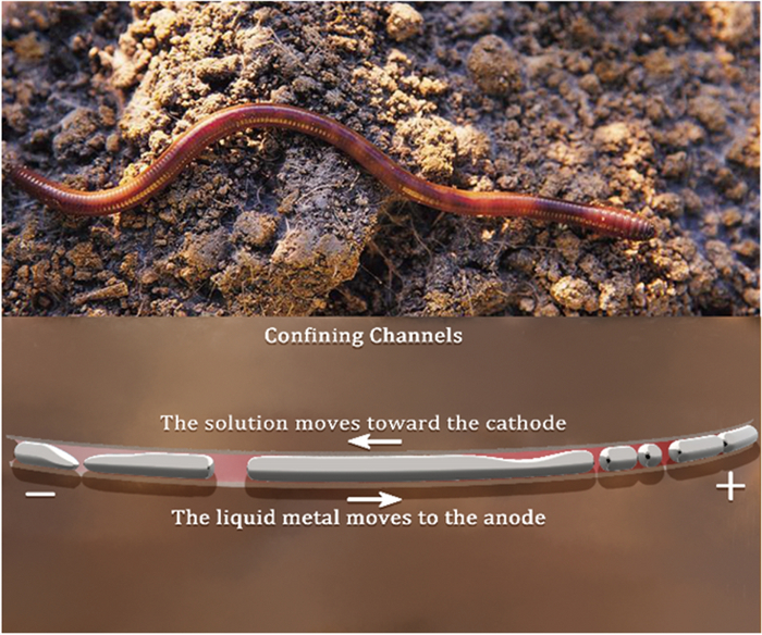 Research on micro-machines is becoming popular. In this paper, the electric driving behavior of liquid metal columns in confining channel was studied. When the electric field was applied, the liquid metal near the negative electrode became flat, longer. The NaOH electrolyte (1.0 mol/L) could flow from the positive electrode to the negative electrode from a small space above the liquid metal column. Besides, the length and volume of the liquid metal would affect its motion and deformation behavior. Both cylindrical liquid column (R = 5 mm, L = 5 cm) and linear liquid column (R = 5 mm, L = 40 cm) exhibit deformable movements, which are similar to the bionic movements of earthworms. The electrically driven liquid metal in closed systems could provide a theoretical basis for droplet actuation in microtubes. It has a very wide application prospect in the field of micro-drive machines.
