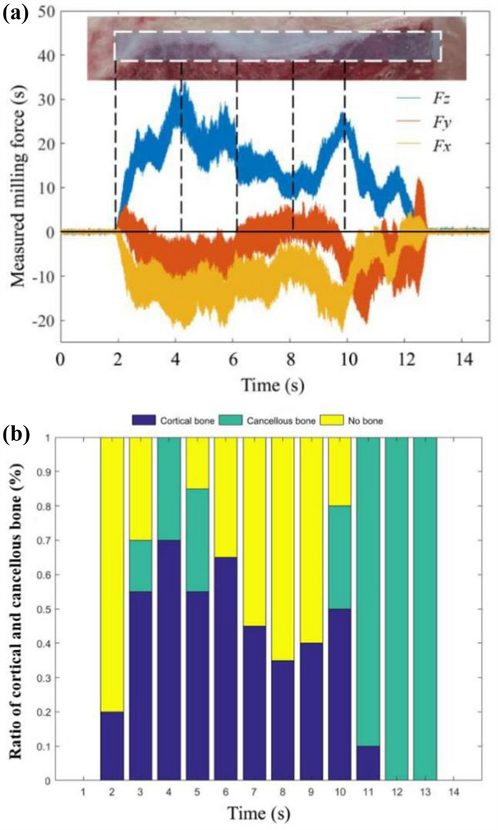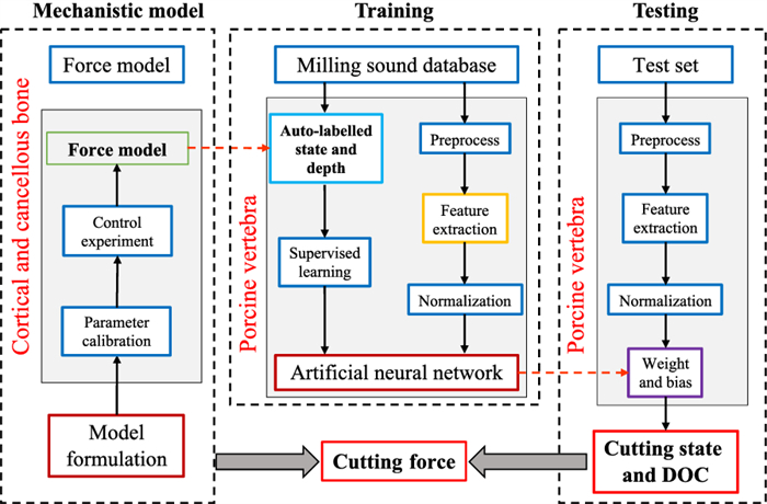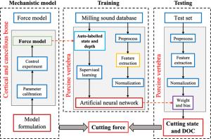 Efficient monitoring of bone milling conditions in orthopedic and neurosurgical surgery can prevent tissue, bone, and tool damage, and reduce surgery time. Current researches are mainly focused on recognizing the cutting state using force signal. However, the force signal during the milling process is difficult and expensive to acquire. In this study, a neural network-based method is proposed to recognize the cutting state and force during the bone milling process using sound signals. Numerical modeling of the cutting force is performed to capture the relationship between the cutting force and the depth of cut in the bone milling process. The force model is used to calibrate the training data to improve the recognition accuracy. Wavelet package transform is used for signal processing to understand bone-cutting phenomena using sound signals. The proposed system succeeds to monitor the bone milling process to reduce the surgical risk. Experiments on standard bone specimens and vertebrae also indicate that the proposed approach has considerable potential for use in computer-assisted and robot-assisted bone-cutting systems used in various types of surgery.