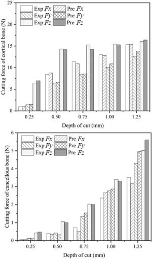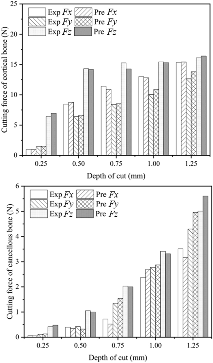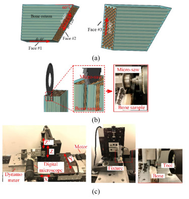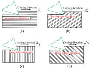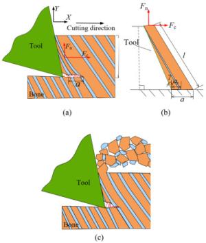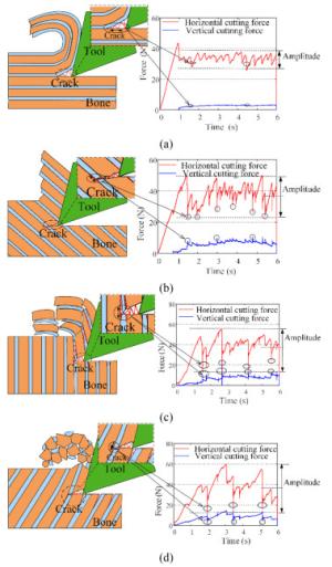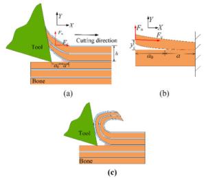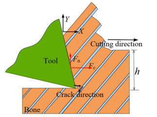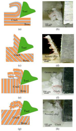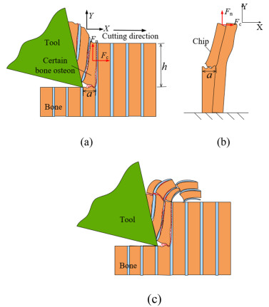 Cortical bone is semi-brittle and anisotropic, that brings a challenge to suppress vibration and avoid undesired fracture in precise cutting process in surgeries. In this paper, a novel analytical model is proposed to represent cortical bone cutting processes. The model is utilized to predict the chip formations, material removal behavior and cracks propagation under varying bone osteon cutting angles and depths. Series of orthogonal cutting experiments were conducted on cortical bone to investigate the impact of bone osteon cutting angle and depth of cut on cutting force, crack initialization and propagation. The observed chip morphology highly agreed with the prediction of chip formation based on the analytical model. The curly, serrated, grainy and powdery chips formed when the cutting angle was set as 0°, 60°, 90°, and 120°, respectively. Cortical bone were removed dominantly by shearing at a small depth of cut from 10 to 50 μm, and by a mixture of pealing, shearing, fracture and crushing at a large depth of cut over 100 μm at different bone osteon angles. Moreover, its fracture toughness was calculated based on measured cutting force. It is found that the fluctuation of cutting force is suppressed and the bone material becomes easy to remove, which attributes to lower fracture toughness at bone osteon cutting angle 0°. When the cutting direction develops a certain angle to bone osteon, the fracture toughness increases then the crack propagation is inhibited to some extent and the fluctuation of cutting force comparatively decreases. There is a theoretical and practical significance for tools design and operational parameters choice in surgeries.