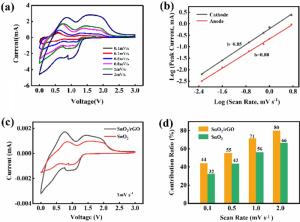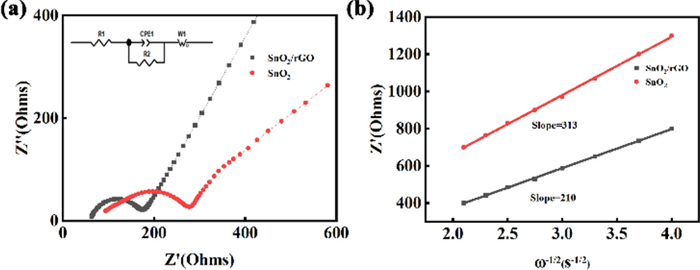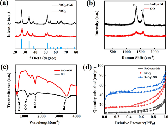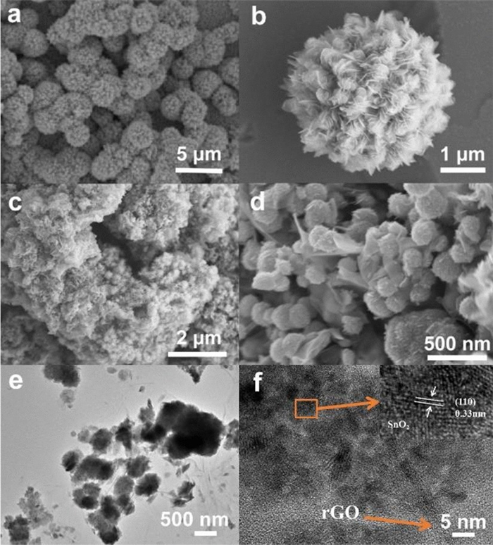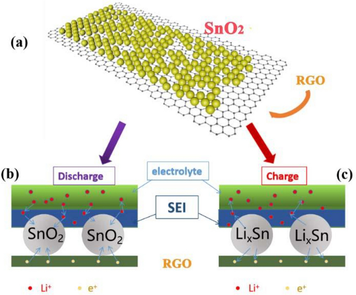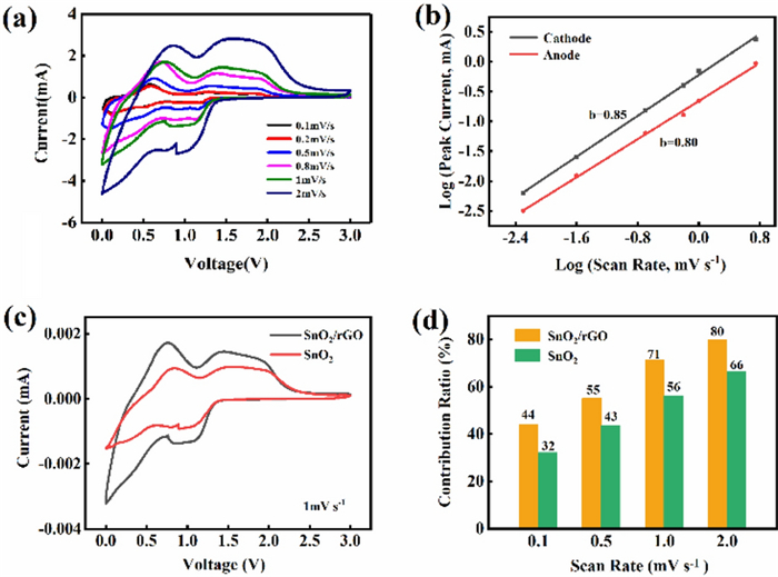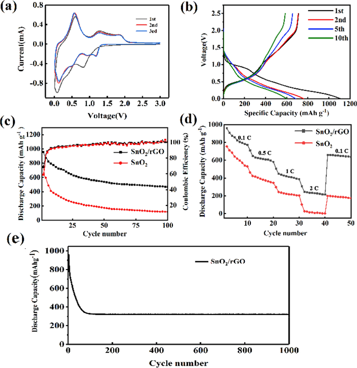 Compared with ordinary graphite anode, SnO2 possesses higher theoretical specific capacity, rich raw materials and low price. While the severe volume expansion of SnO2 during lithium-ion extraction/intercalation limits its further application. To solve this problem, in this work the reduced graphene oxide (rGO) was introduced as volume buffer matrix of SnO2. Herein, SnO2/rGO composite is obtained through one-step hydrothermal method. Three-dimensional structure of rGO could effectively hinder the polymerization of SnO2 nanoparticles and provide more lithium storage sites attributed to high specific surface area and density defects. The initial discharge capacity of the composite cathode is 959 mA·h·g-1 and the capacity remained at 300 mA·h·g-1 after 1000 cycles at 1 C. It proved that the rGO added in the anode has a capacity contribution to the lithium-ion battery. It changes the capacity contribution mechanism from diffusion process dominance to surface driven capacitive contribution. Due to the addition of rGO, the anode material gains stable structure and great conductivity.