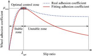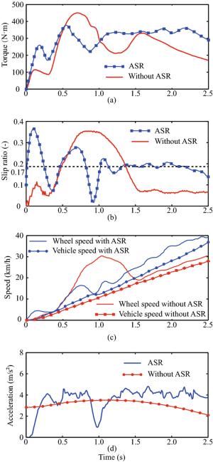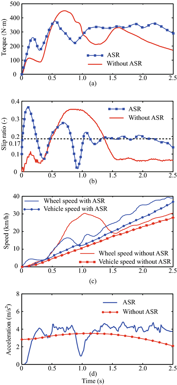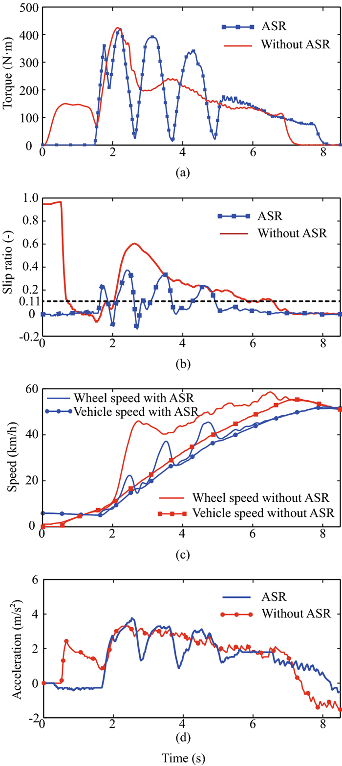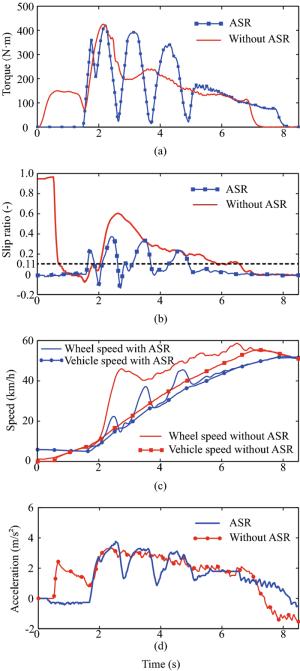 Due to quick response and large quantity of electric motor torque, the traction wheels of battery electric vehicle are easy to slip during the initial phase of starting. In this paper, a sliding mode control approach of acceleration slip regulation is designed to prevent the slip of the traction wheels. The wheel slip ratio is used as the state variable for the formulation of system dynamics model. The fuzzy algorithm is utilized to adjust the switch function of sliding mode controller. After stability and robustness analysis, the sliding mode control law is transferred into C code and downloaded into vehicle control unit, which is validated under wet and dry road conditions. The experimental results with a small overshoot and a quick response during starting indicate that the sliding mode controller has good control effect on the slip ratio regulation. This article proposes an acceleration slip regulation method that improves the safety during acceleration for battery electric vehicle.