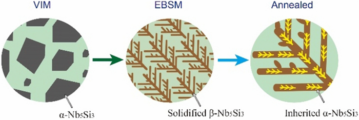 For hypereutectic Nb-Si based alloys, primary Nb5Si3 phases typically grow in a faceted mode during equilibrium or near-equilibrium solidification, which damages the ductility and toughness. To address this issue, here we artificially manipulate the growth morphology of Nb5Si3 using electron beam surface melting (EBSM) and subsequent annealing treatments. Results show that such a non-equilibrium solidification pathway enables the transition from faceted growth to non-faceted dendritic growth of Nb5Si3, along with evident microstructure refinement, generation of metastable β-Nb5Si3 phases and elimination of chemical segregation. The transformation from β-Nb5Si3 to α-Nb5Si3 and Nb solid solution (Nbss) particles is triggered by the annealing treatment at 1450 ℃ for 5 h. Also, we find the annealing-mediated formation of inherited Nb5Si3 dendrites that maintain the dendritic morphology of the original as-solidified β-Nb5Si3 dendrites. This work thus provides a feasible routine to obtain thermally stable and refined α-Nb5Si3 dendrites in hypereutectic Nb-Si based alloys.