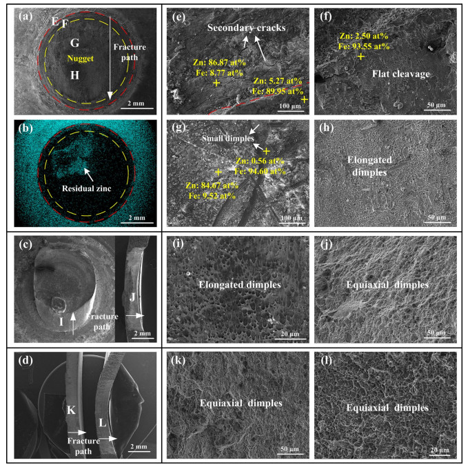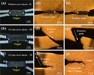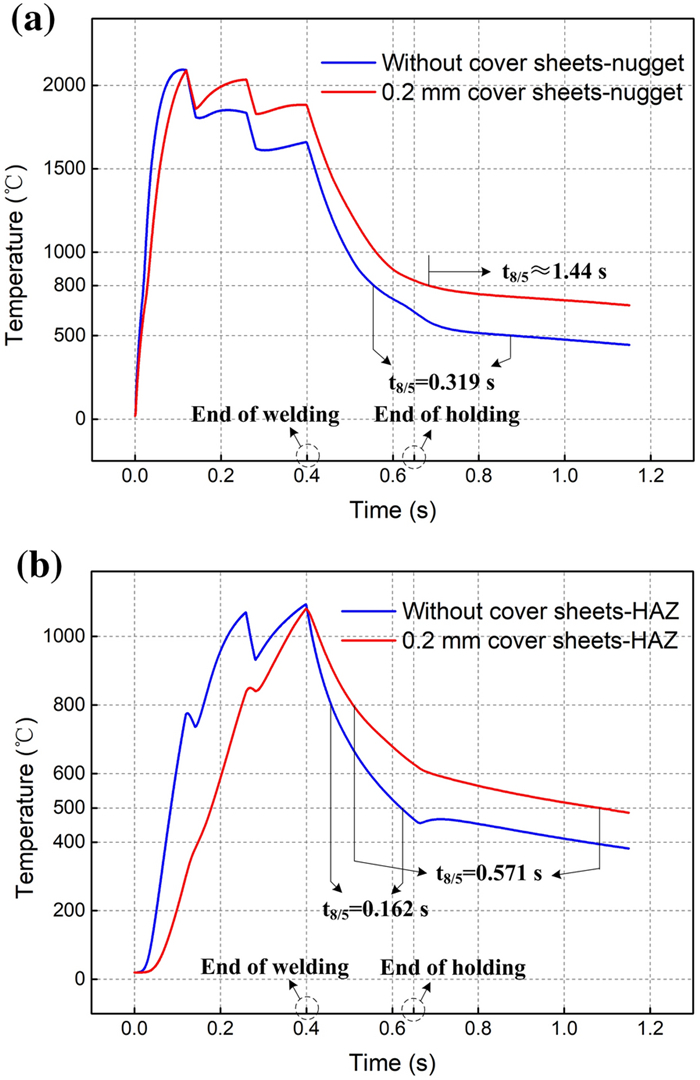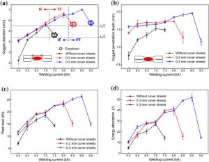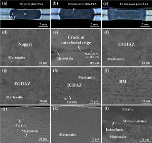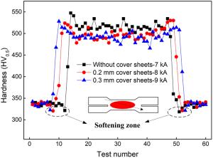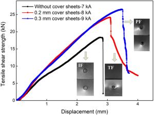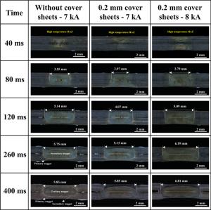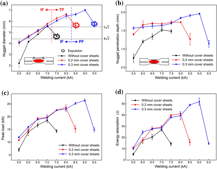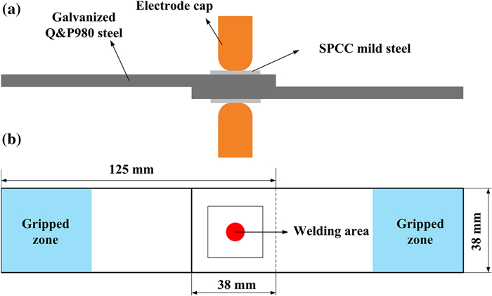The resistance spot weldability of galvanized ultra-high-strength steels is not satisfied, the joints are prone to interfacial fracture and the weldable current range is narrow. To solve the problems, a novel method called resistance spot welding with double-sided cover sheets was introduced to weld a galvanized Q&P980 steel with the thickness of 1.2 mm. Two thin SPCC mild steel sheets were chosen as cover sheets and were placed symmetrically at both sides between the Q&P980 steels and the electrodes, then the RSW process was carried out. Compared with the traditional RSW method, the joints obtained by using the novel method achieved larger tensile shear strength and energy absorption, which increased by 26.9% and 52.6%, respectively. With increasing the welding current, the failure mode transferred from interfacial fracture to nugget pull-out fracture or base metal tearing fracture. By contrast, the joints always showed interfacial fracture without cover sheets. The improvement of the joint performance was mainly attributed to the enlargement of the nugget. With the help of finite element simulation, it was found that the cover sheets helped increase the contact area and reduced the current density during welding, which postponed the expulsion, and a larger area could be evenly heated. The application of the novel method can be easily extended to the resistance spot welding of other ultra-high-strength steels with various thicknesses.